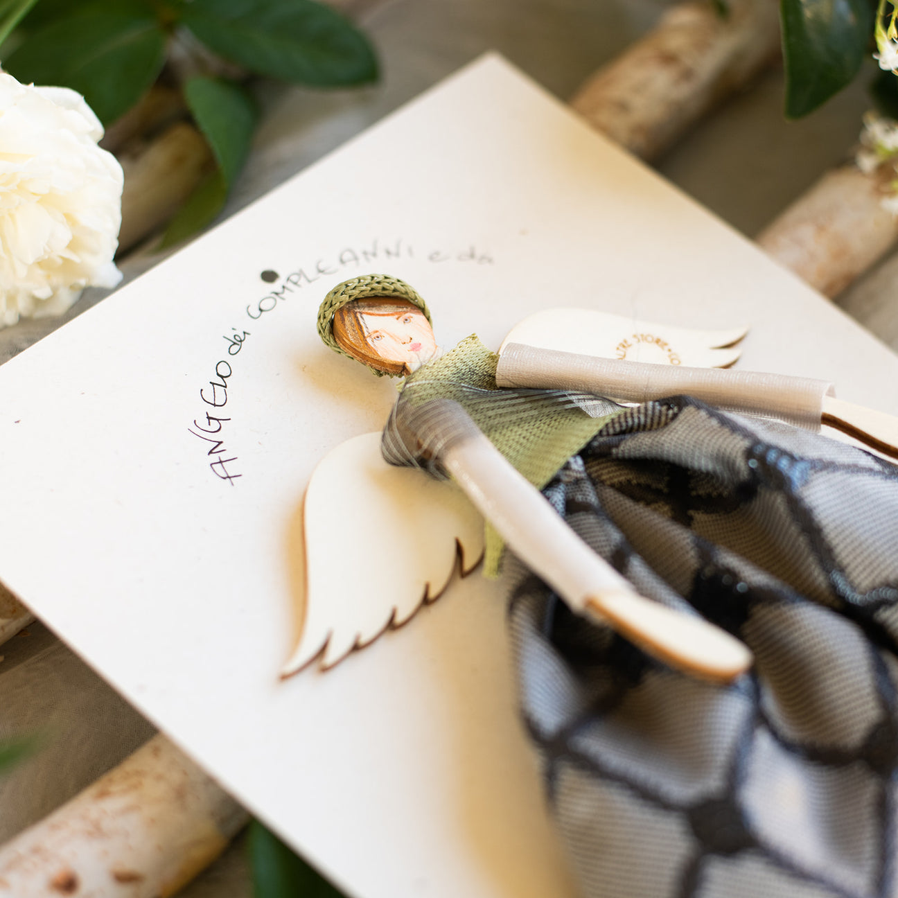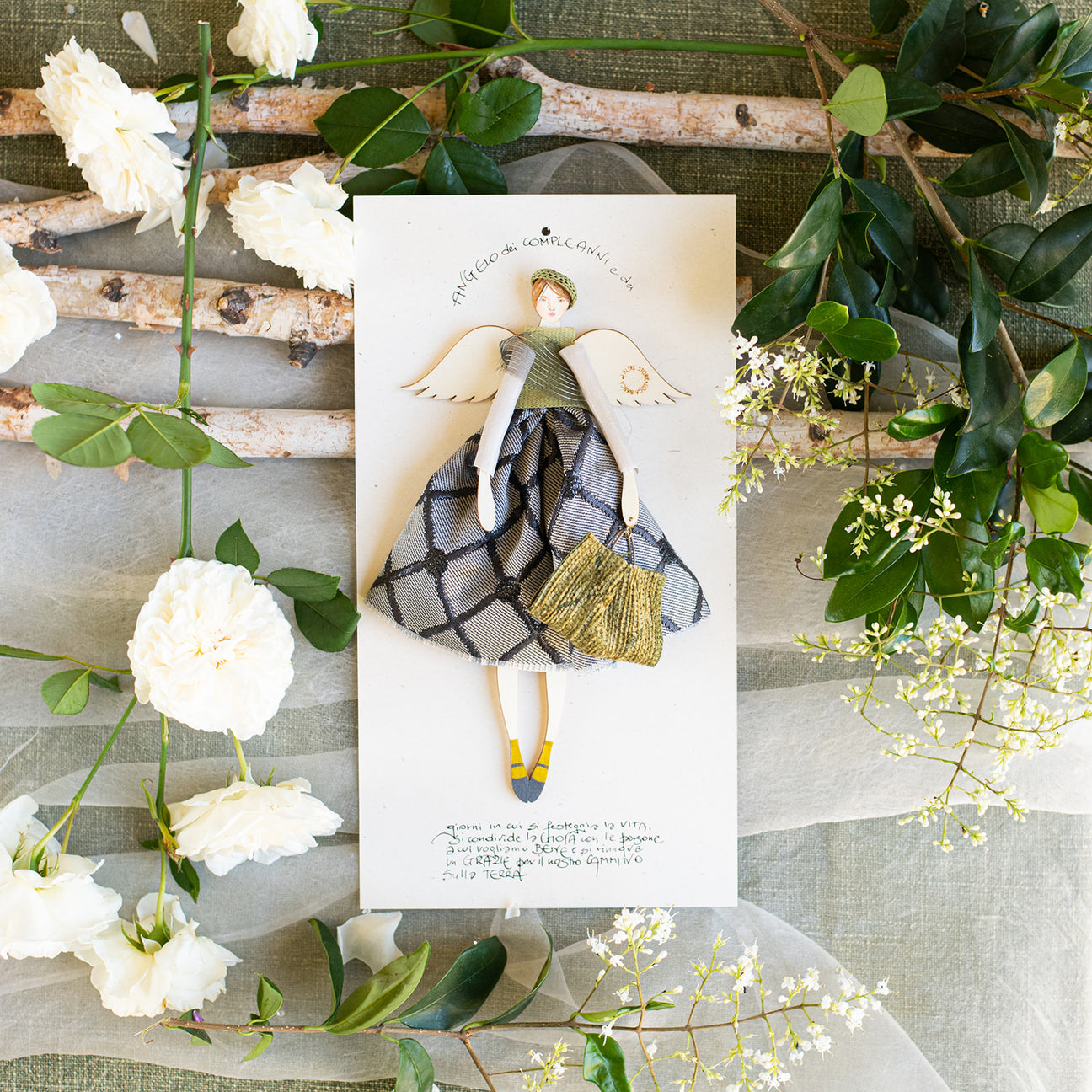 Angelo di legno di pioppo dipinto e vestito a mano, abito in jaquard con fantasia geometrica color antracite e grigio, corpetto e maniche velati, borsetta in tessuto. Angelo dei compleanni. Regalo ARTIGIANALE culturale e poetico, calligrafia. Packaging per un regalo perfetto o un pensiero del cuore. Fatto a mano in Italia.