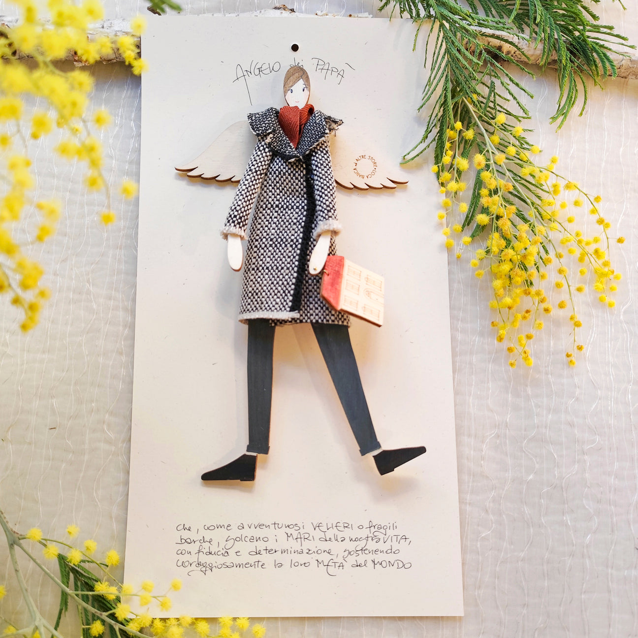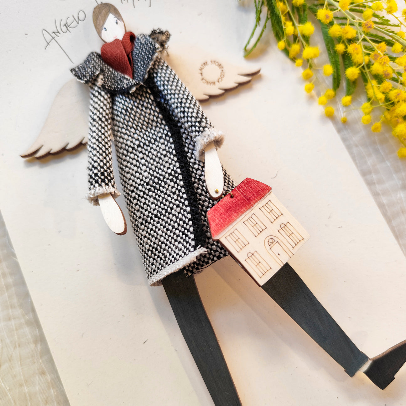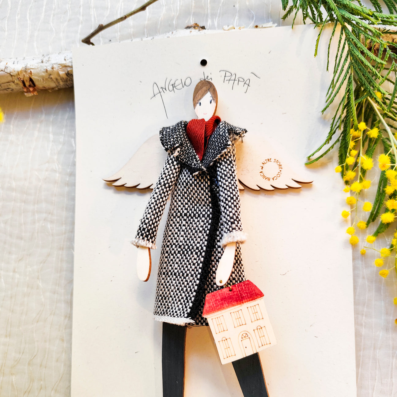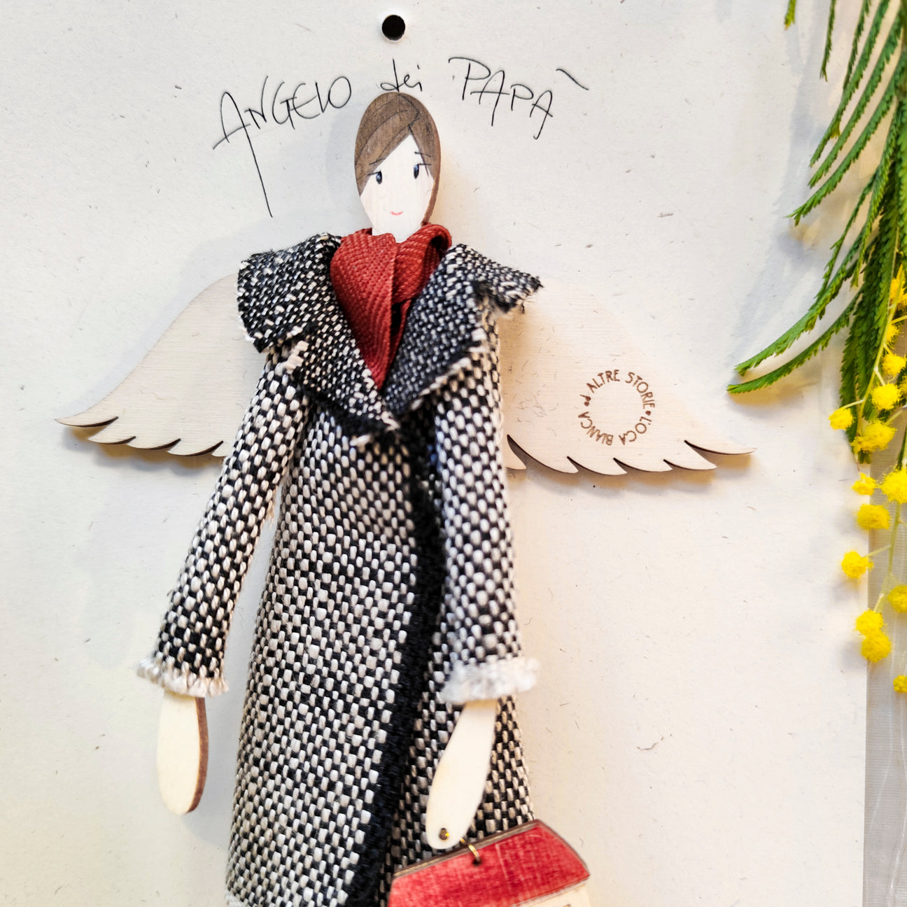 Angeli di legno di pioppo dipinti e vestiti a mano, abiti in tessuti pregiati, seta, cotone, raso o altro utilizzando stoffe di fine serie e upcycling. Regalo culturale e poetico.