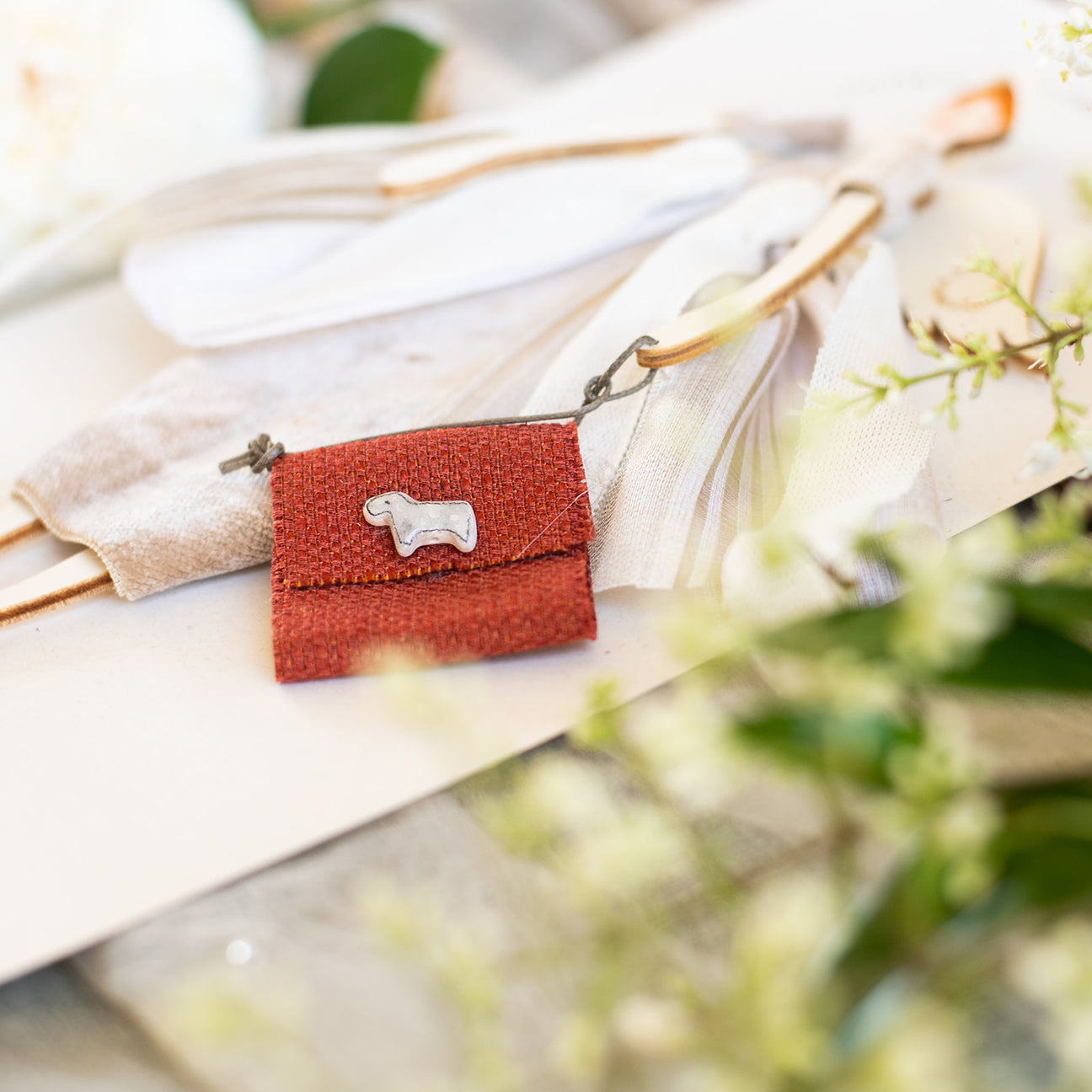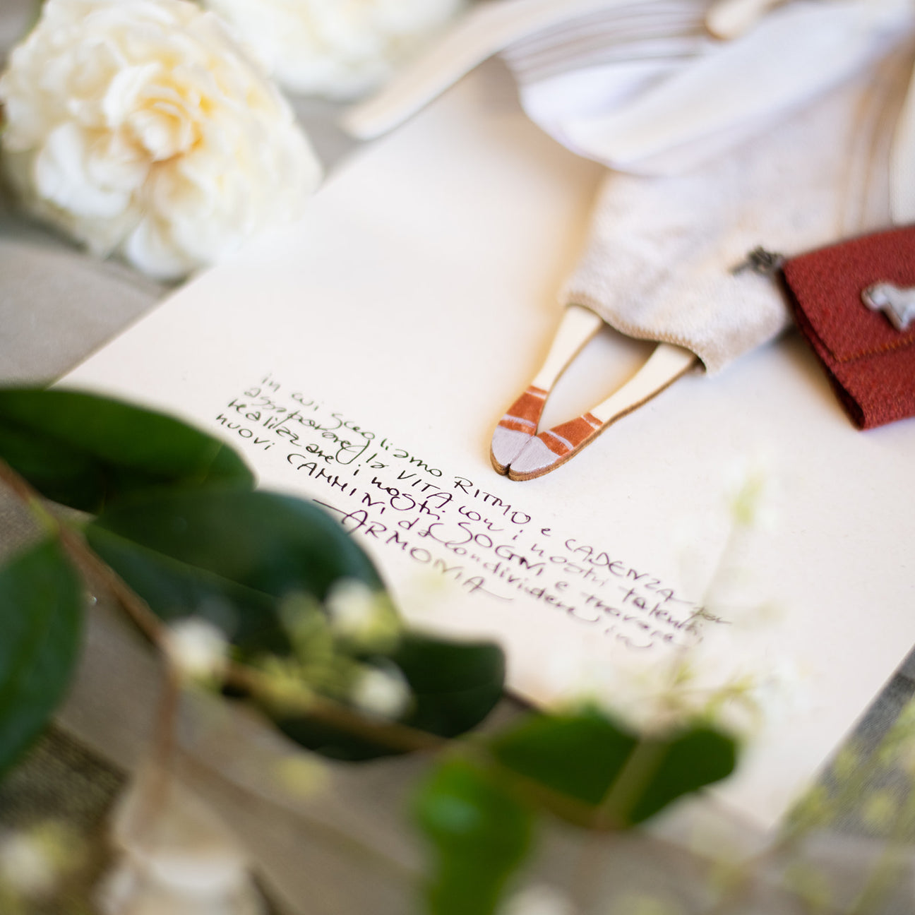 in velluto color tortora, con dettagli in velo e nastri, borsetta in tessuto con piccola ceramica di Laura di @bottonienonsolo