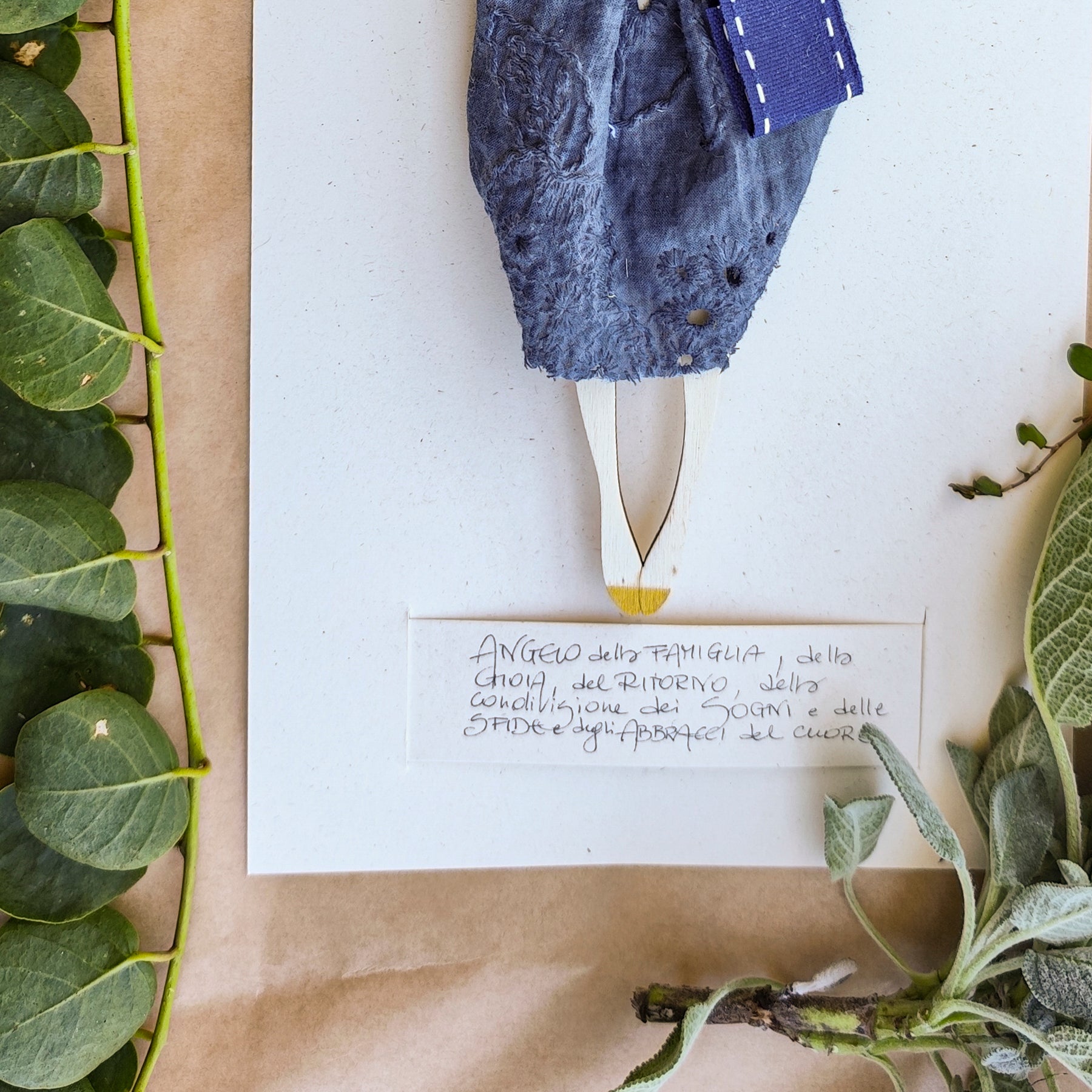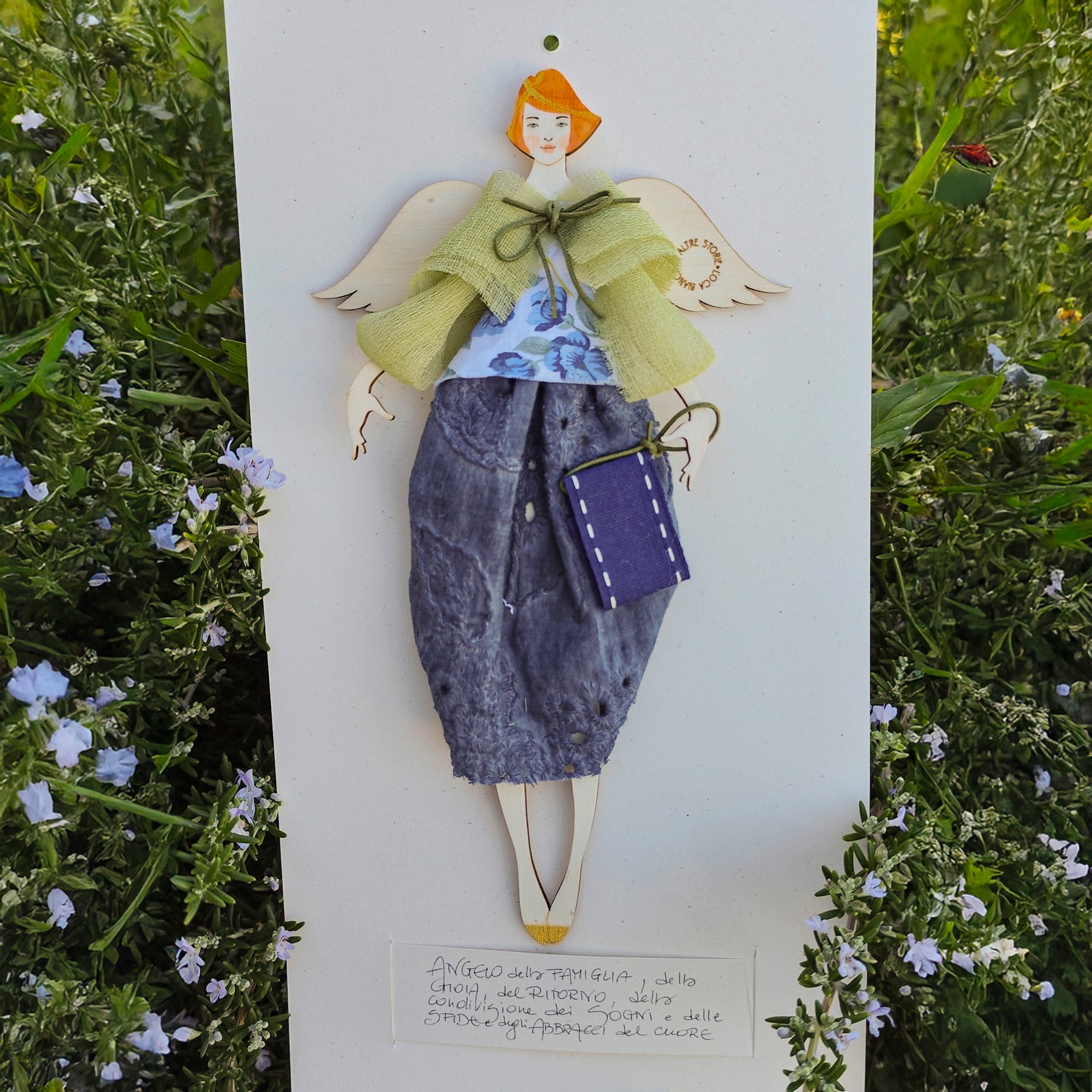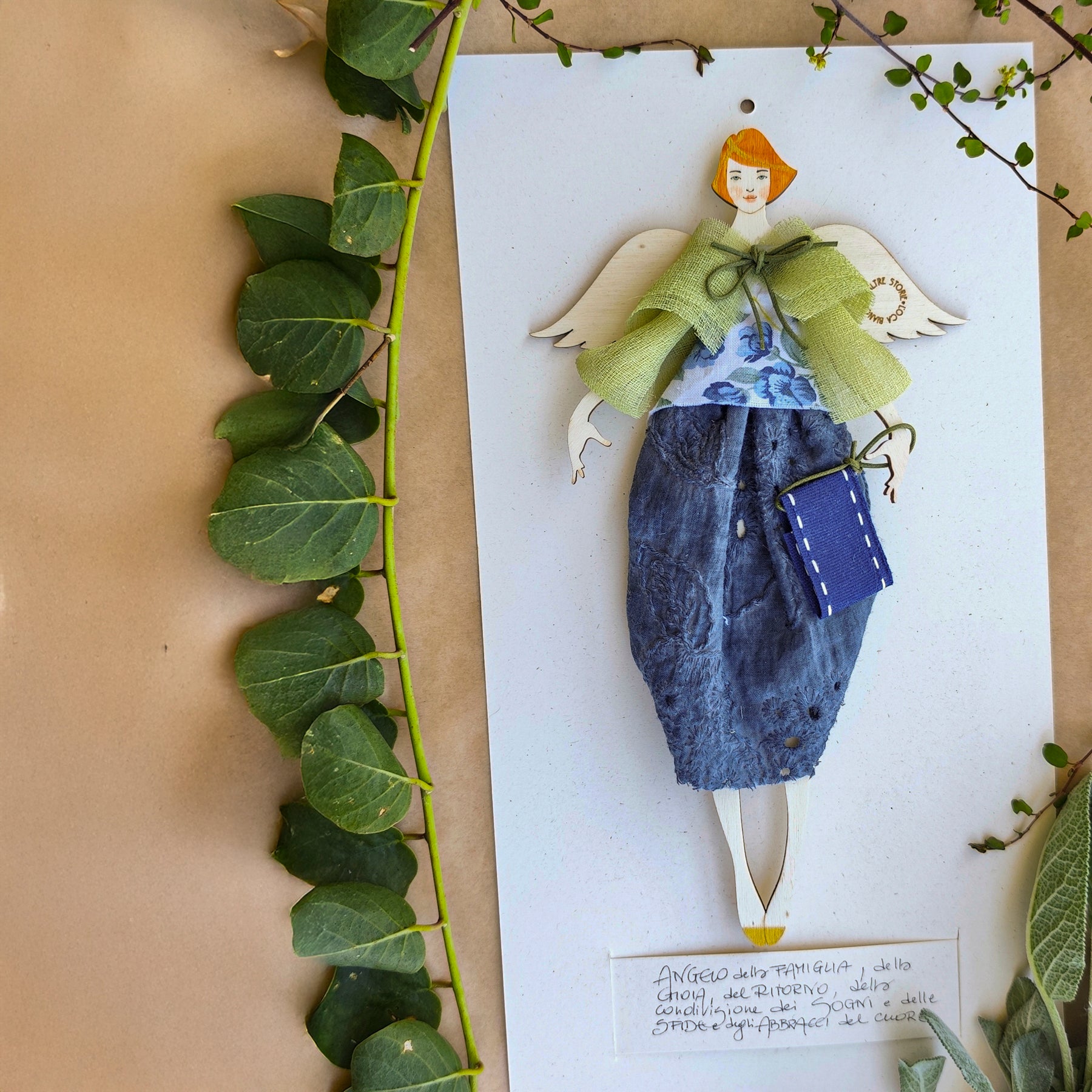 Angeli di legno di pioppo dipinti e vestiti a mano, abiti in tessuti pregiati, seta, cotone, raso o altro utilizzando stoffe di fine serie e upcycling. Regalo culturale e poetico.