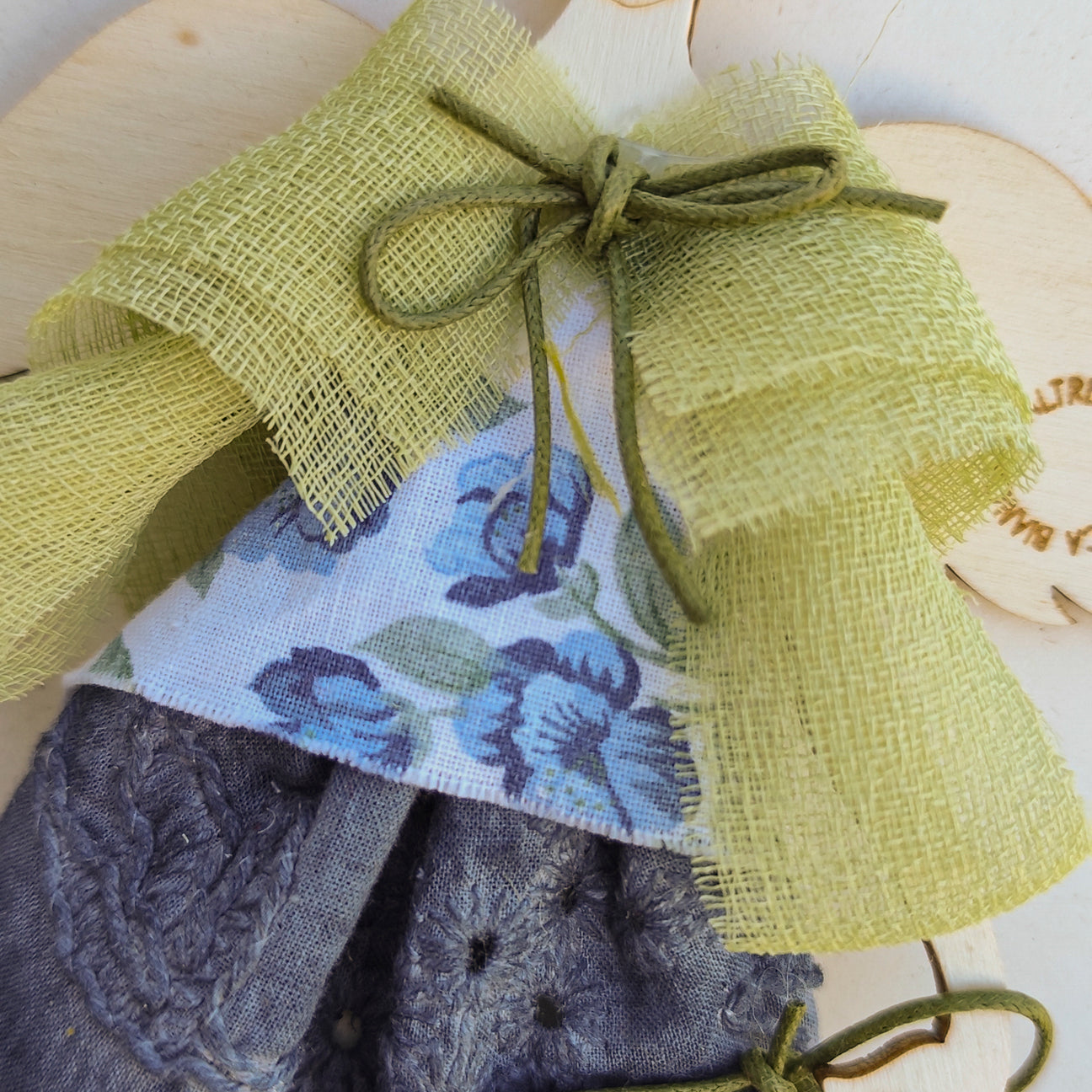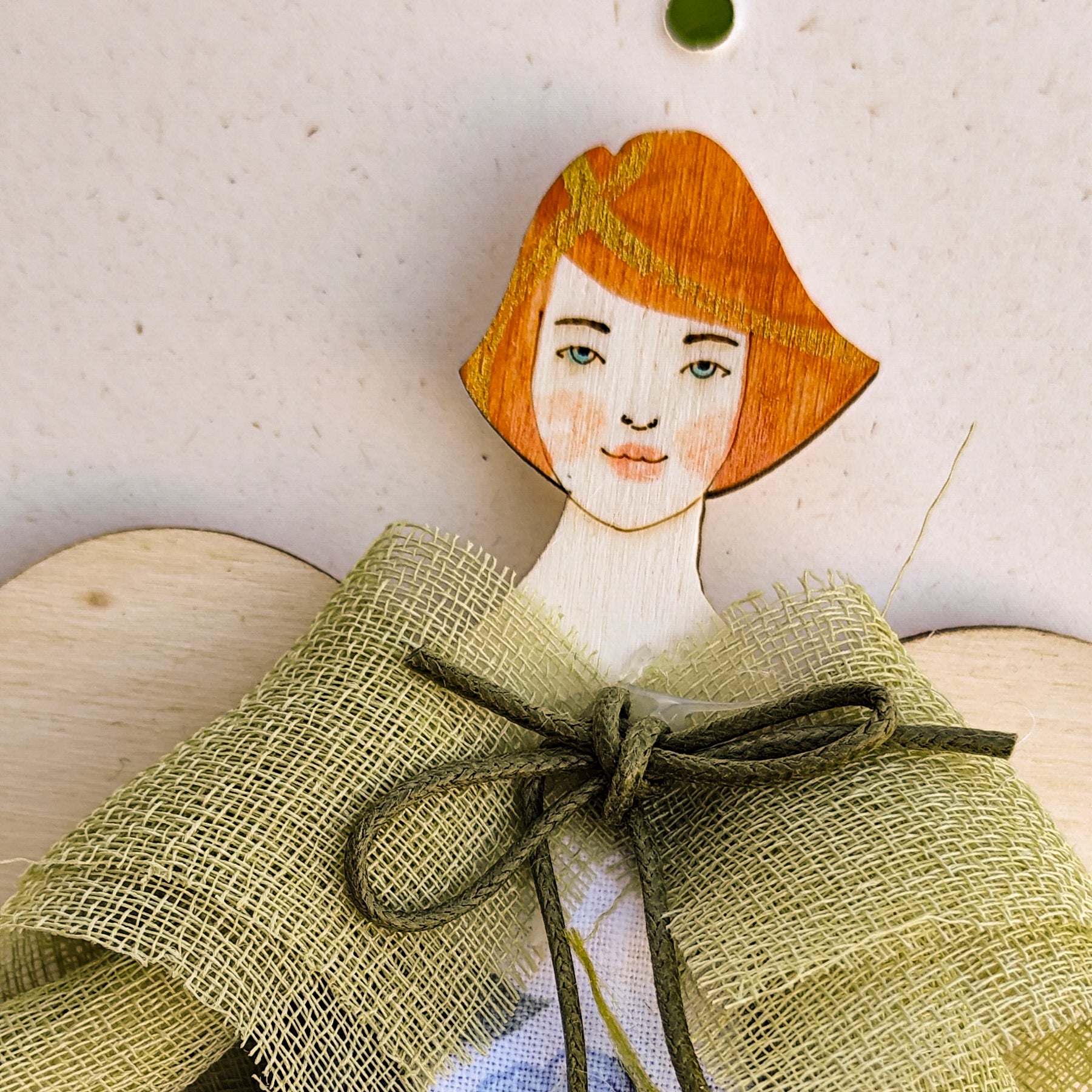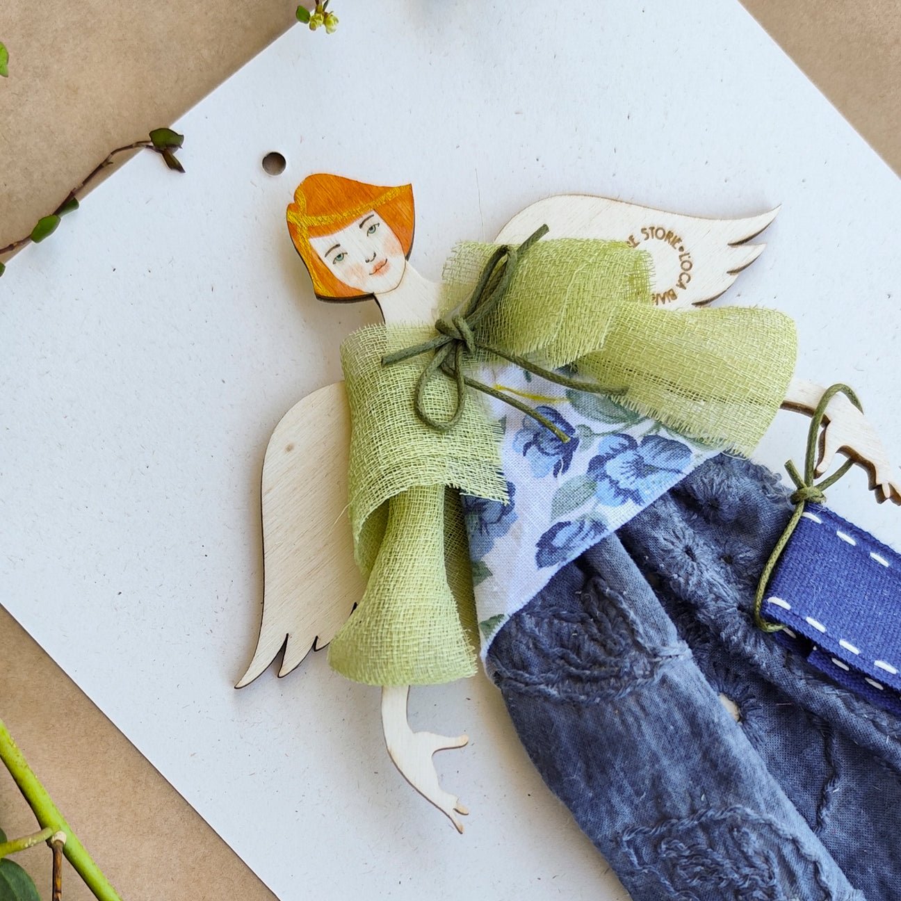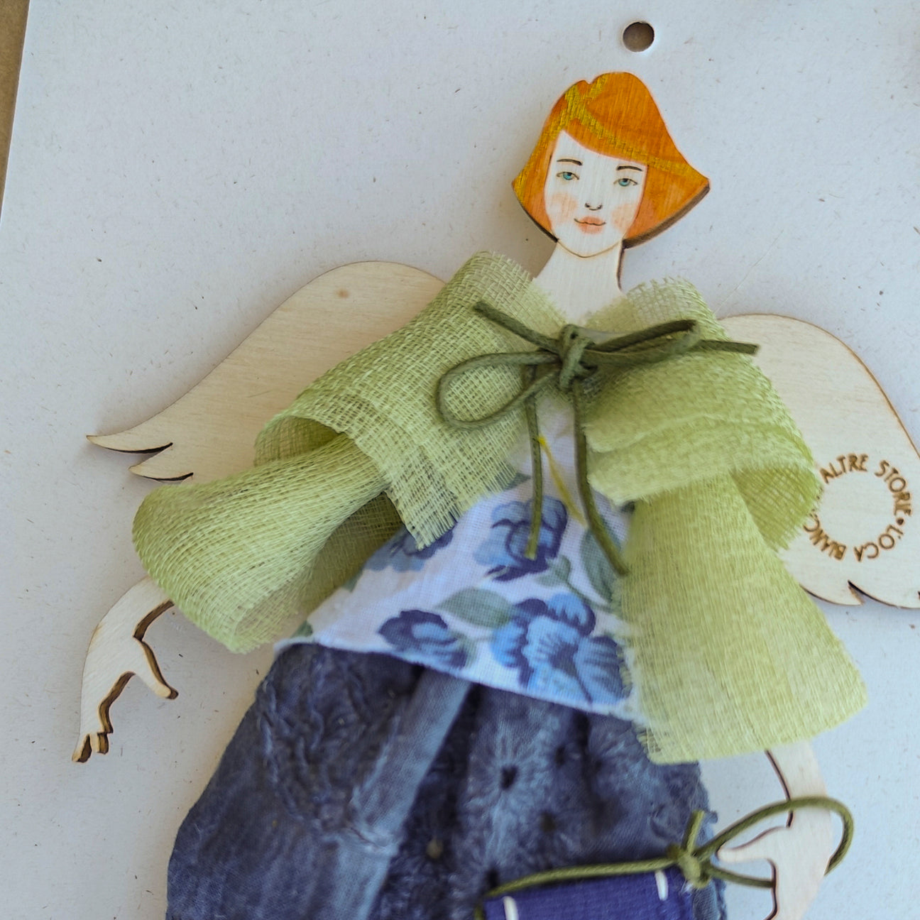 Angeli di legno di pioppo dipinti e vestiti a mano, abiti in tessuti pregiati, seta, cotone, raso o altro utilizzando stoffe di fine serie e upcycling. Regalo culturale e poetico.