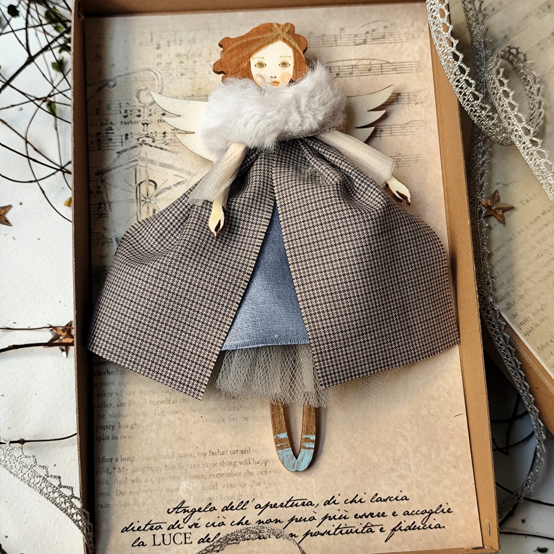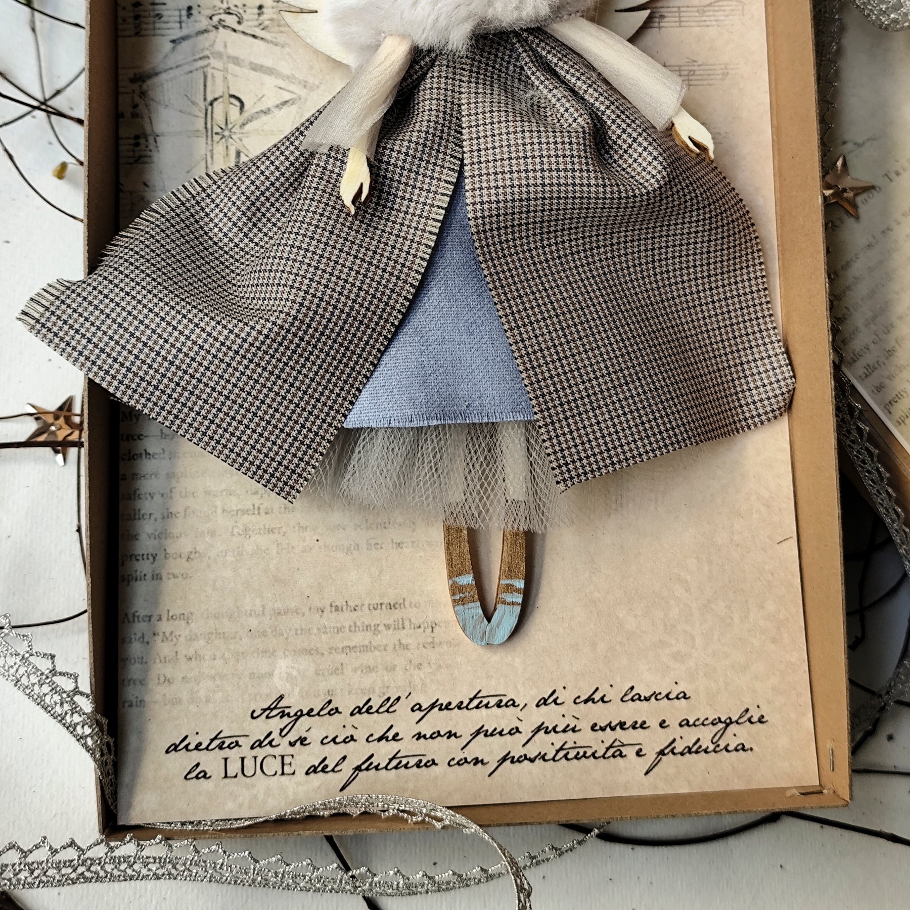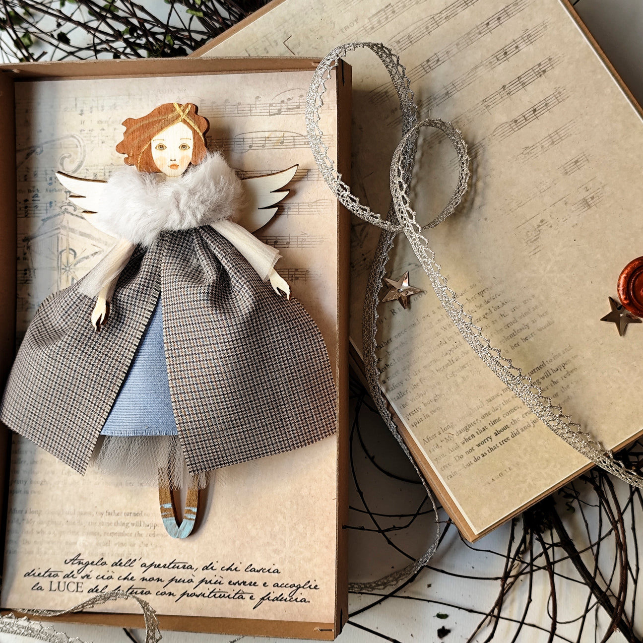 Questo ANGELO fa parte di una piccola serie di 5 angeli un po' VINTAGE pensati per il periodo natalizio, la scatola avana, inclusa, è decorata con un sigillo in ceralacca.