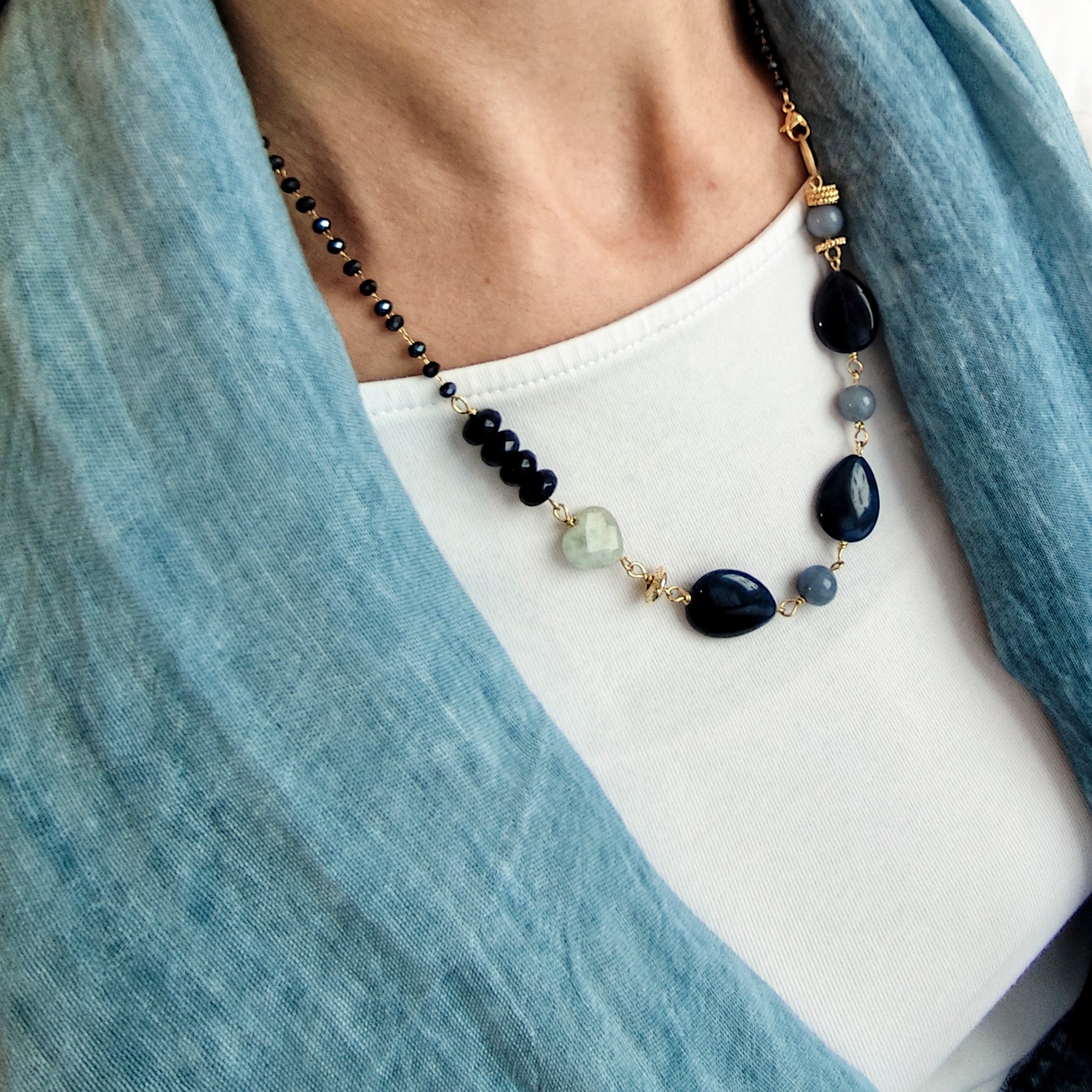 E' una collana con una parte centrale preziosa composta da perle grandi ovali e sfaccettate di GIADA ZAFFIRO alternate a perle di AVVENTURINA, ACQUAMARINA BERILLI e due ALI di rosario blu scuro.