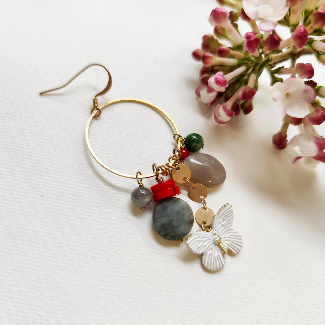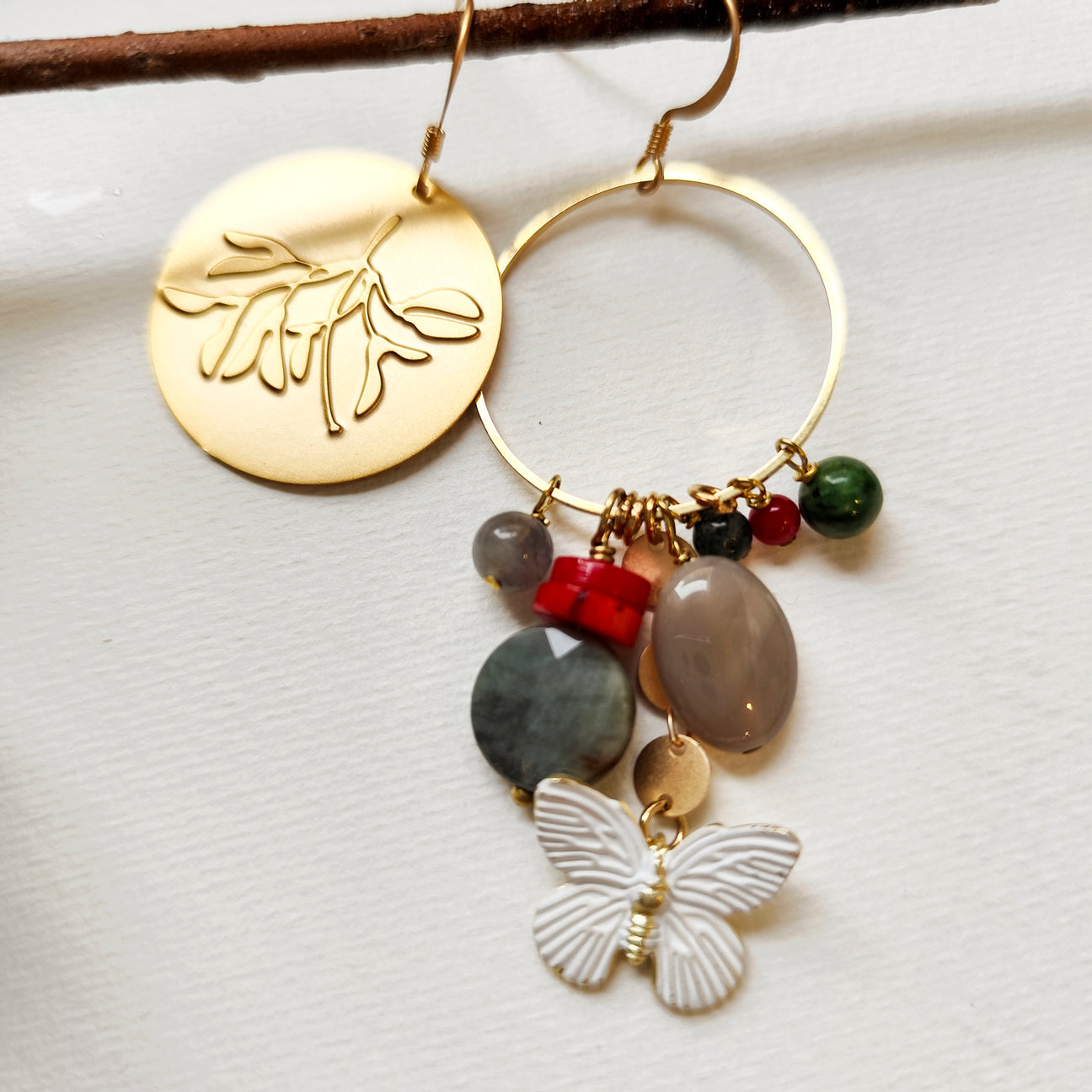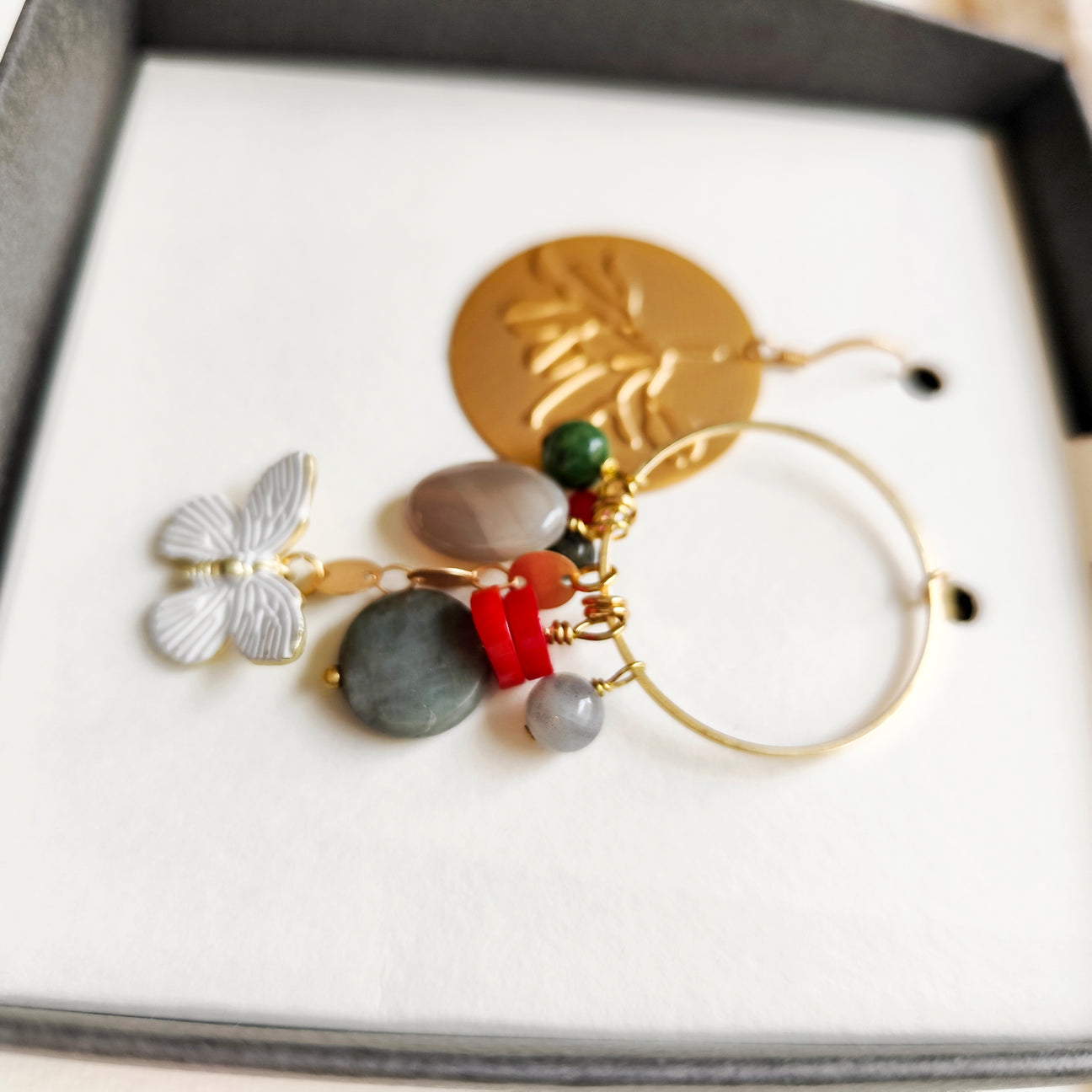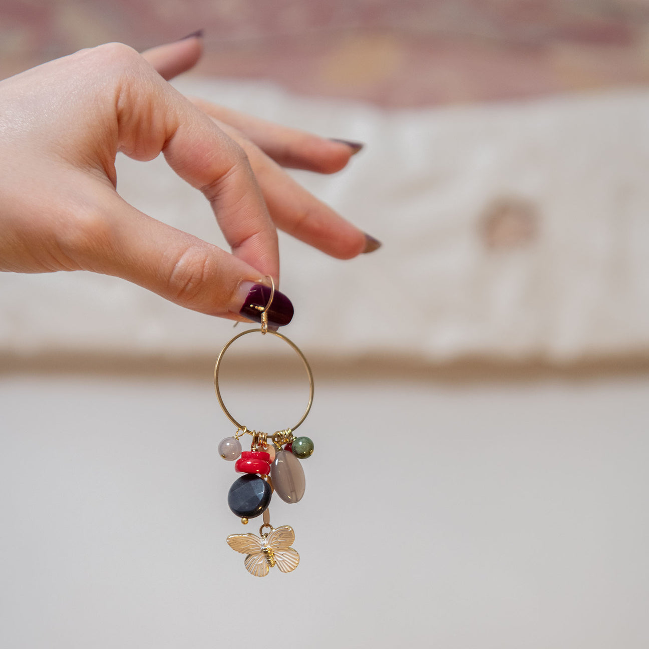 Orecchini FARFALLA-ACERO toni neutri con tocco di rosso, occhio di falco, agata, corallo