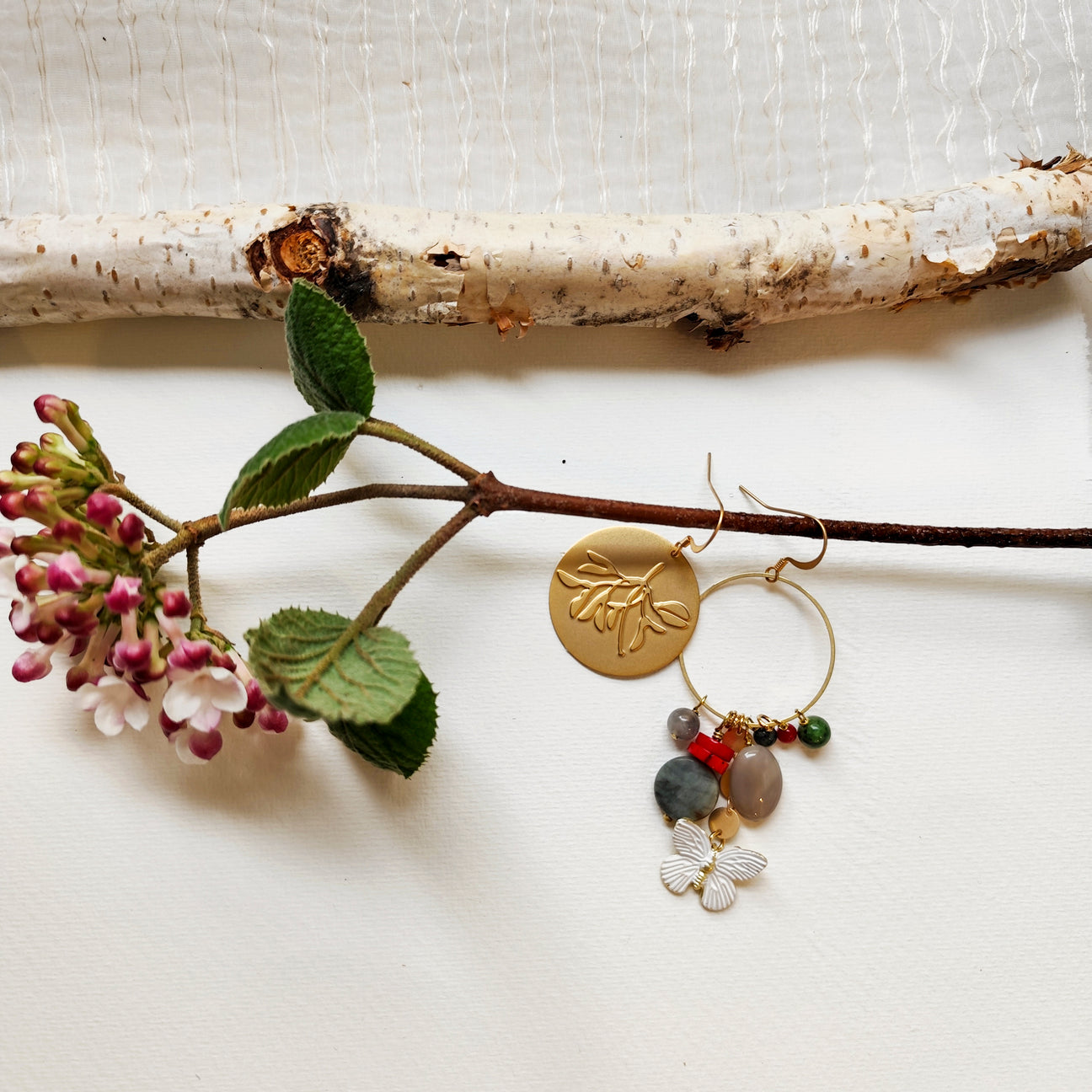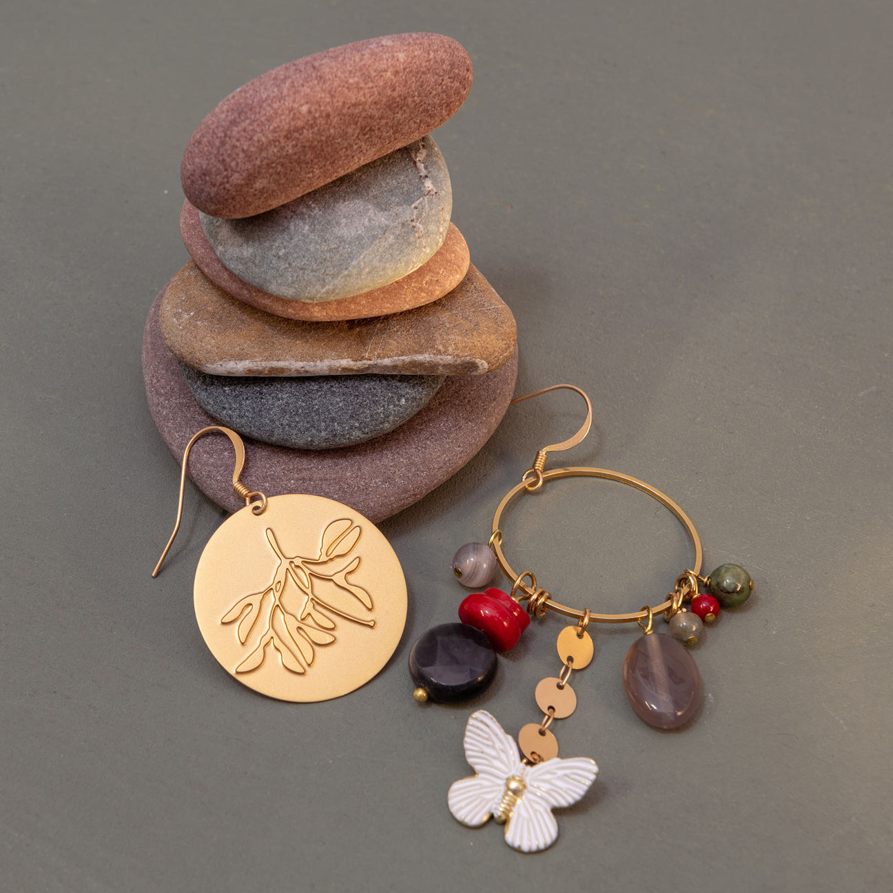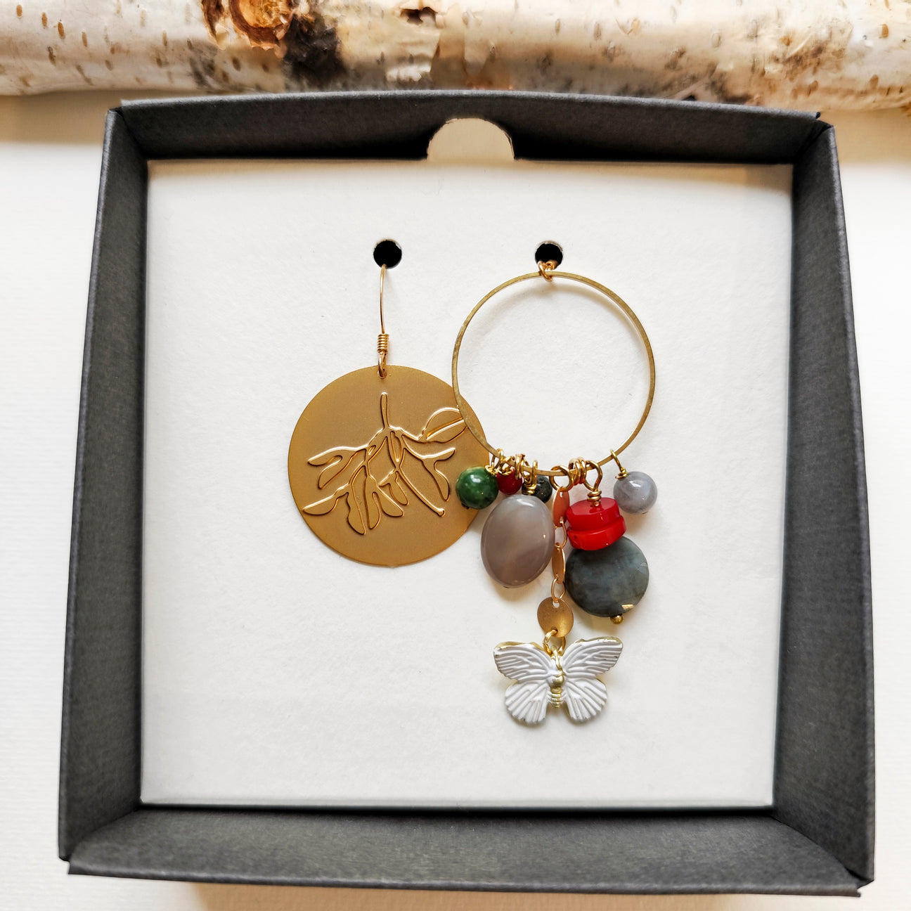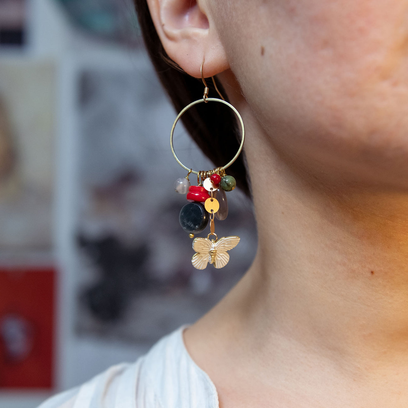 Orecchini FARFALLA-ACERO toni neutri con tocco di rosso, occhio di falco, agata, corallo