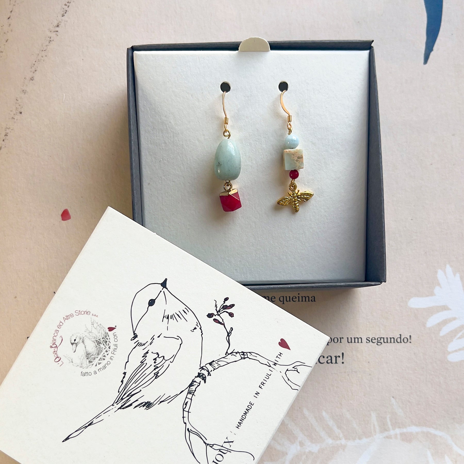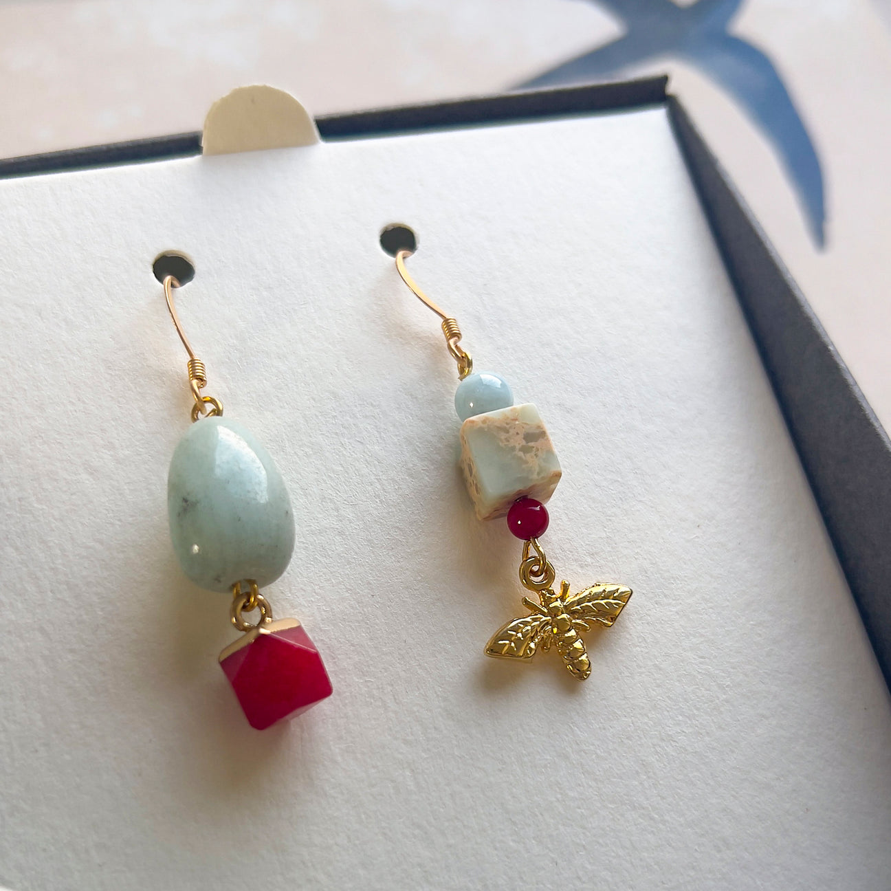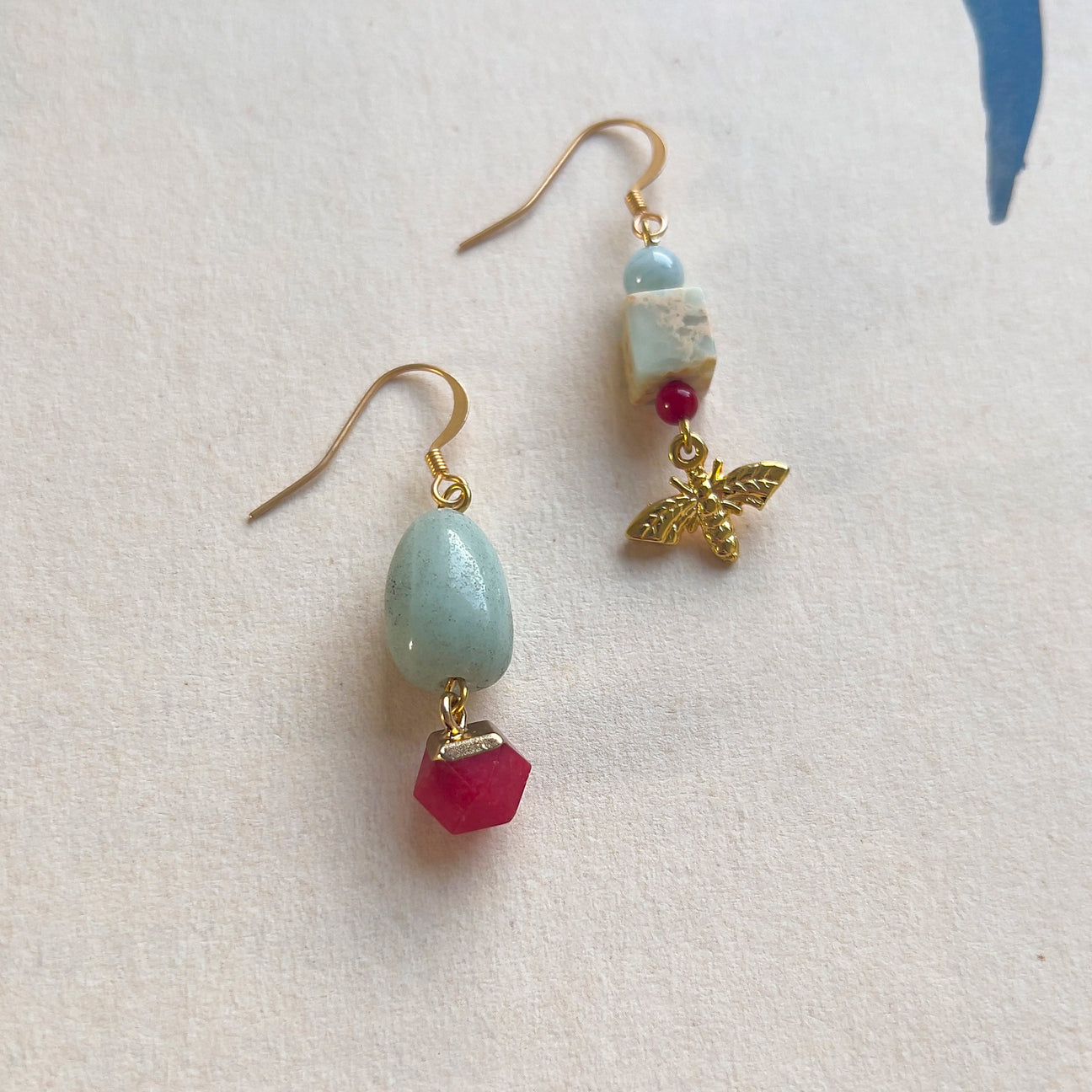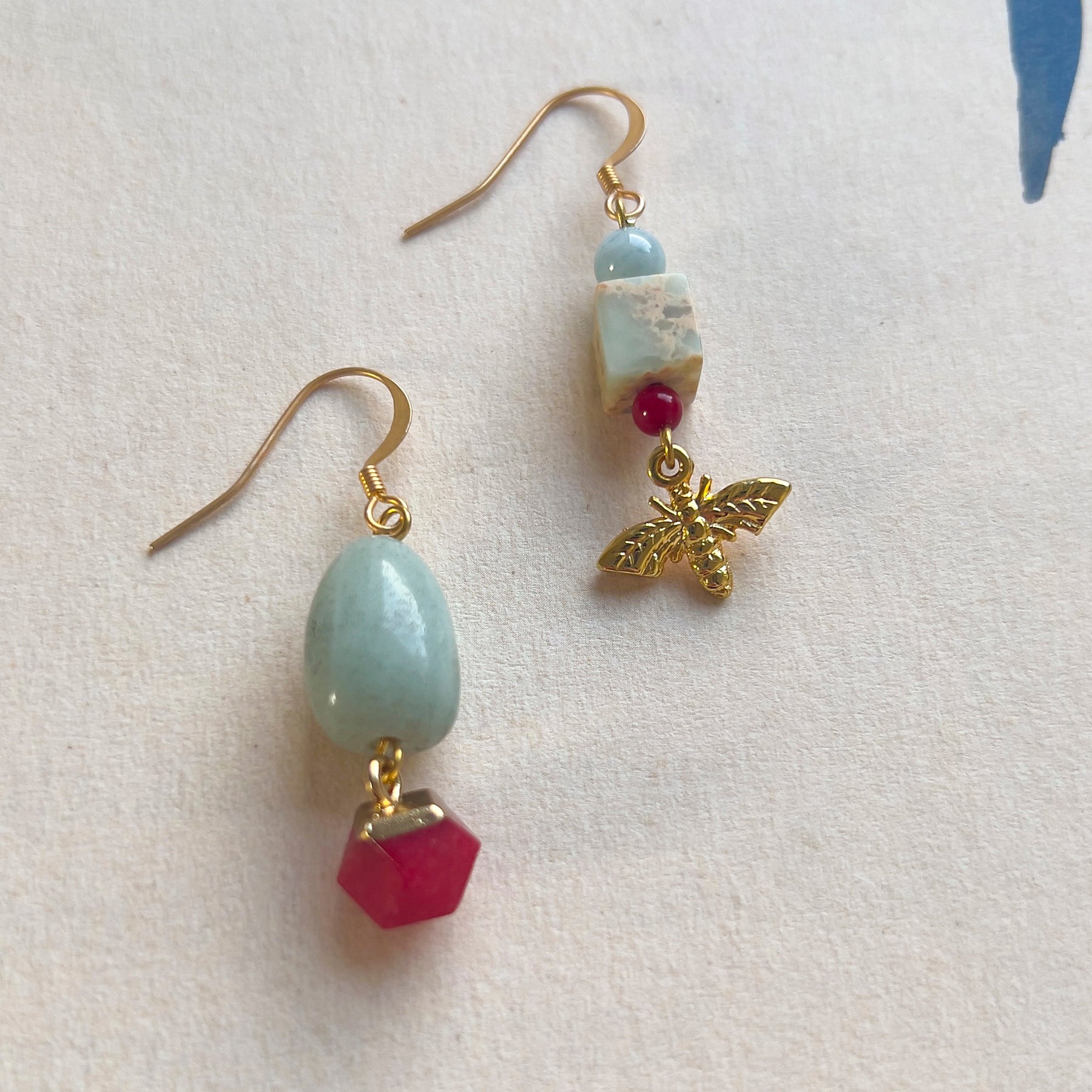 E' una coppia di orecchini asimmetrici pendenti con perle di AMAZZONITE e DIASPRO FIORITO