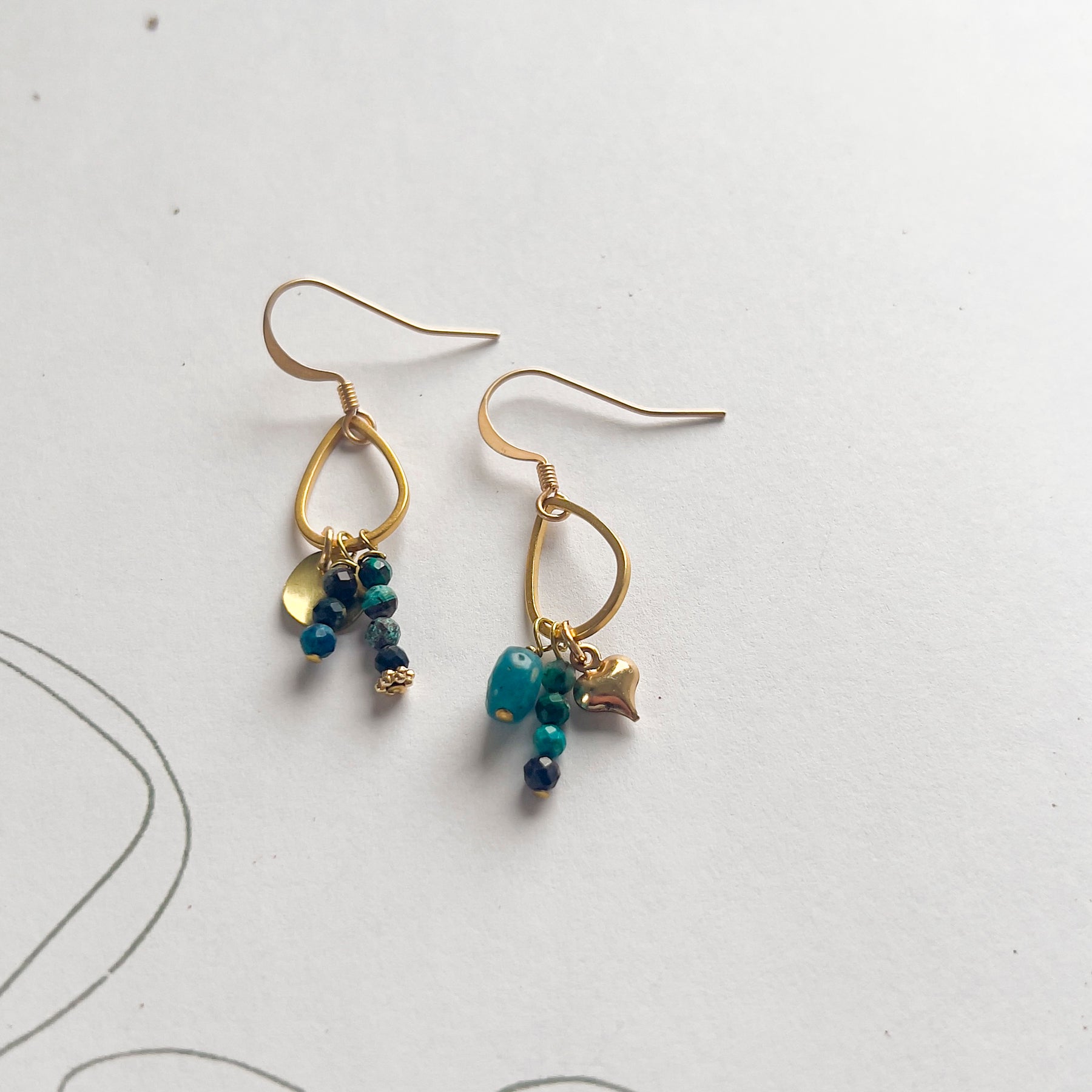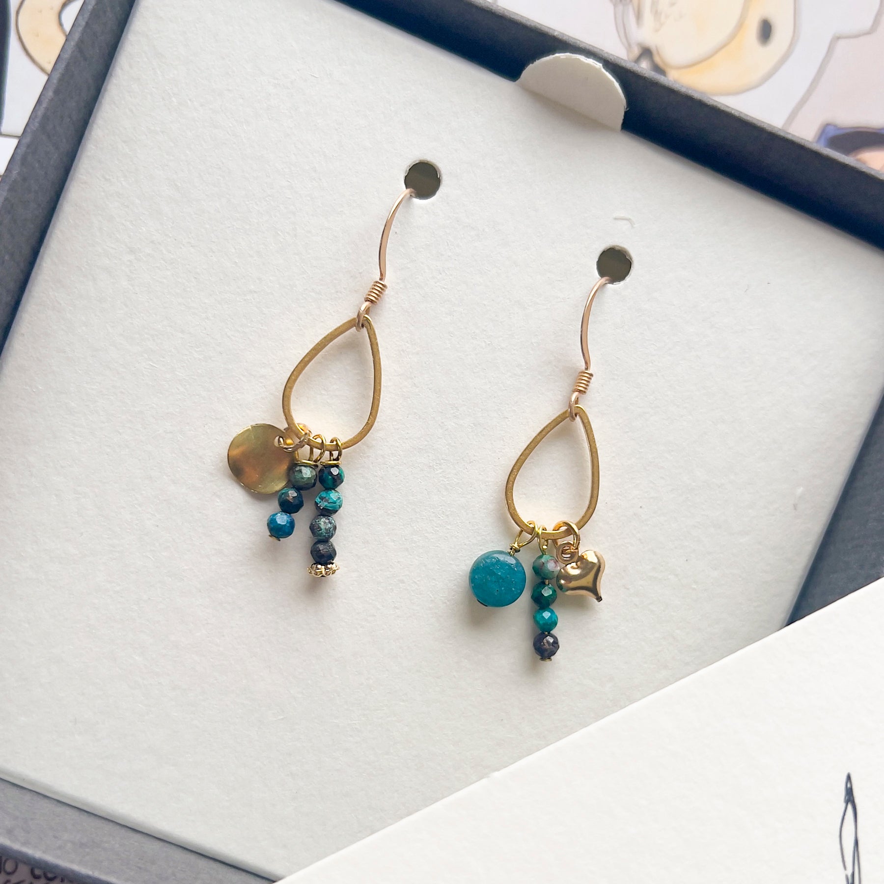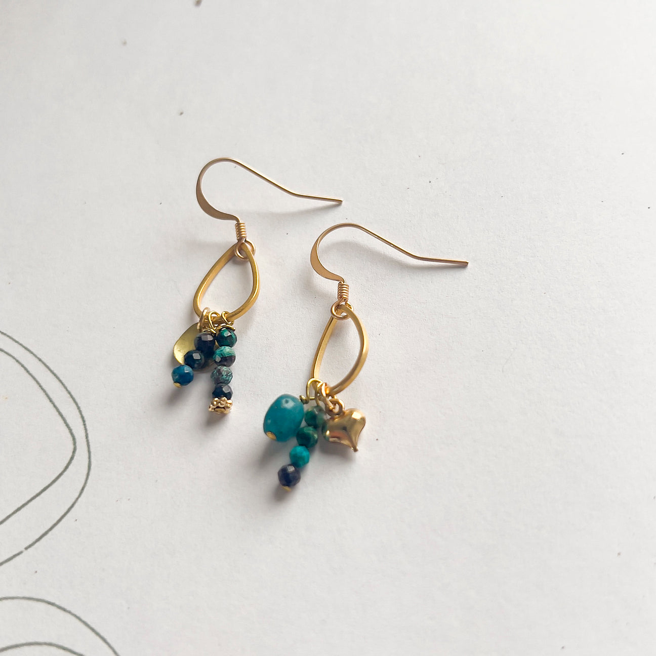 E' una coppia di orecchini asimmetrici pendenti con gocce dorate e bellissime pietre dure