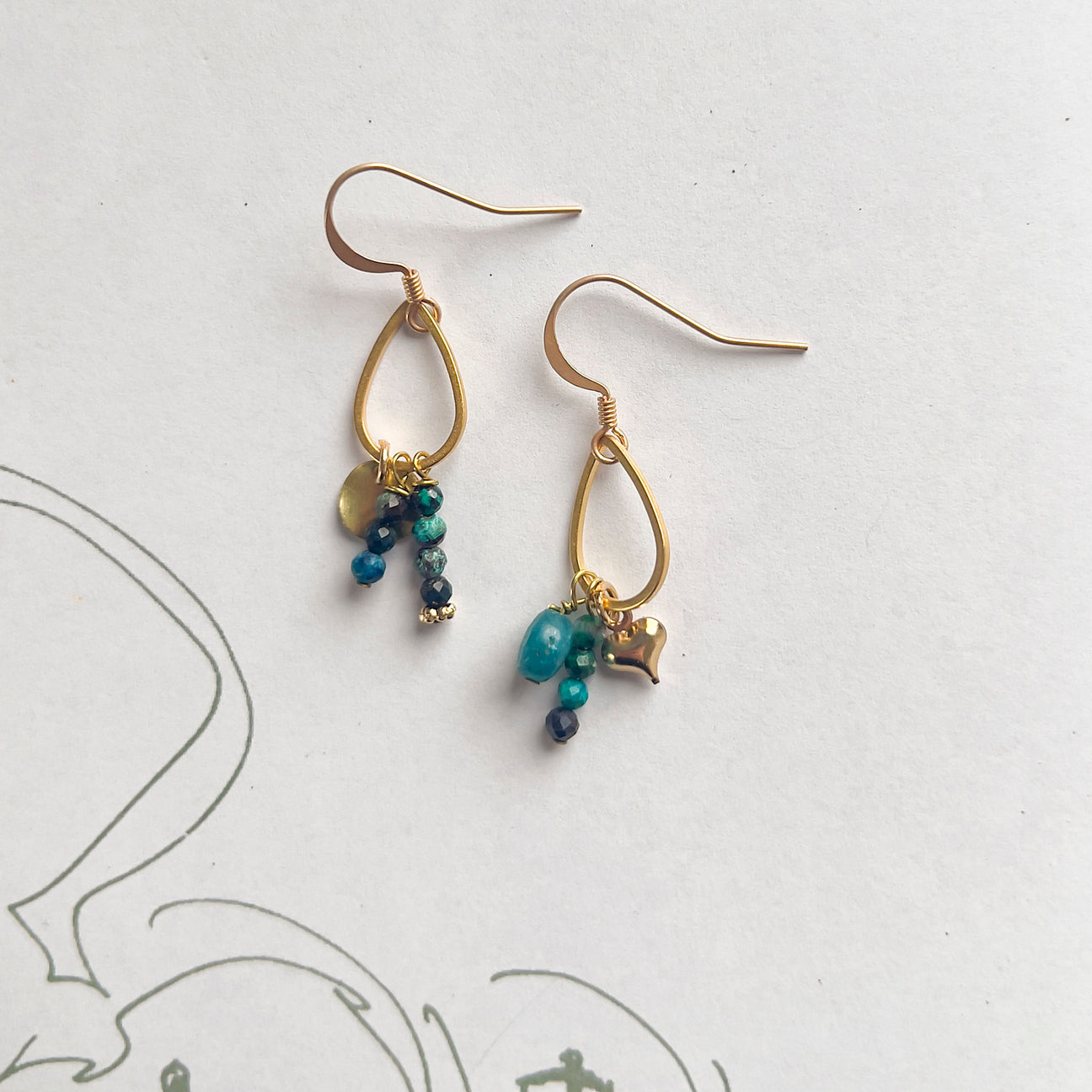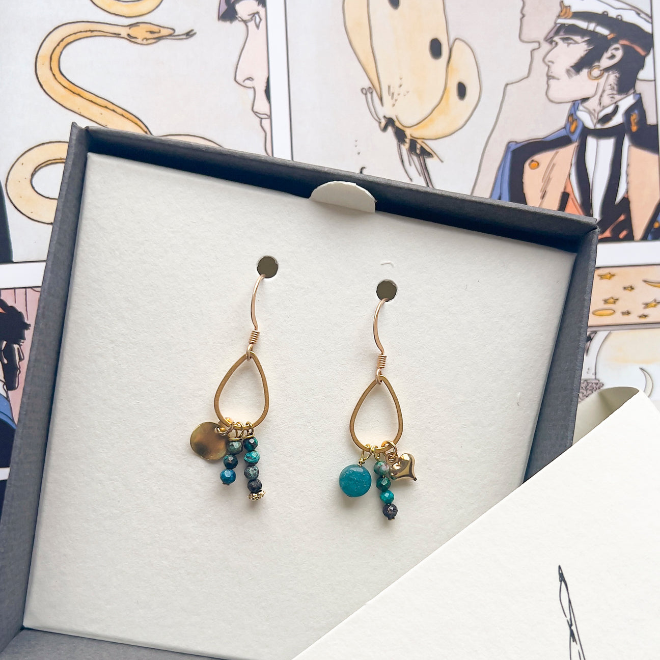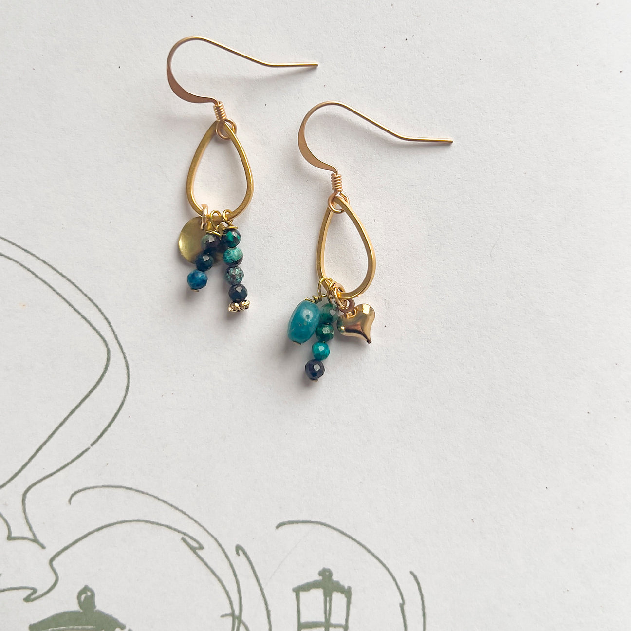 E' una coppia di orecchini asimmetrici pendenti con gocce dorate e bellissime pietre dure