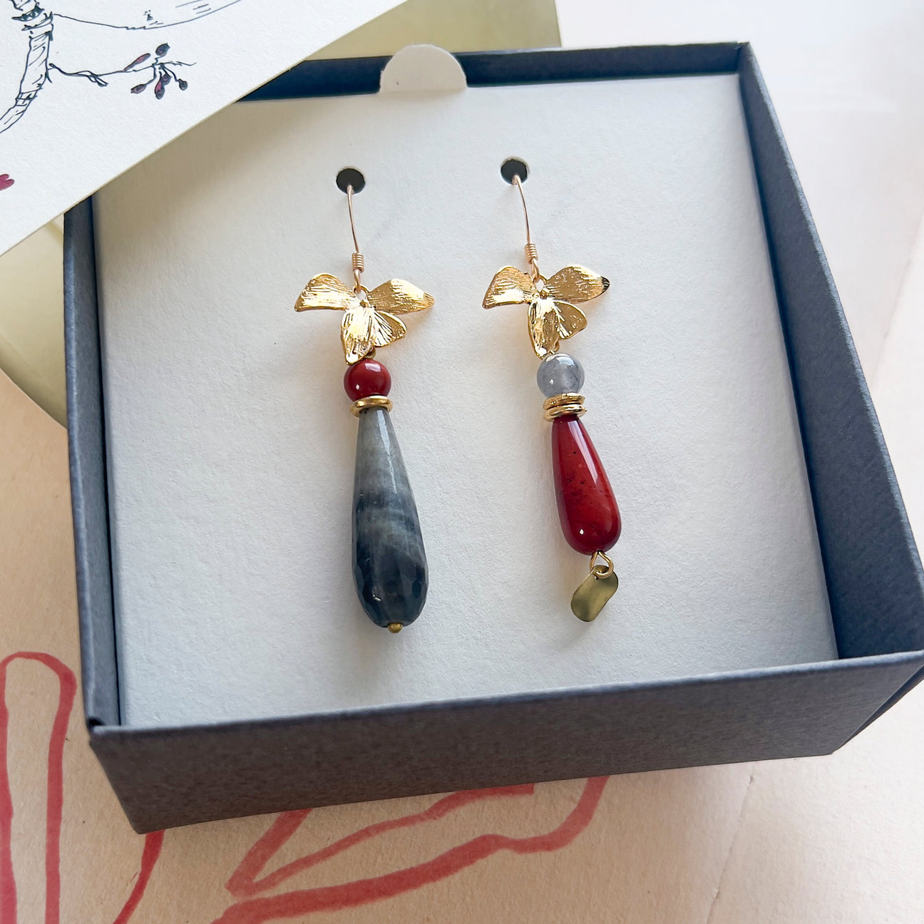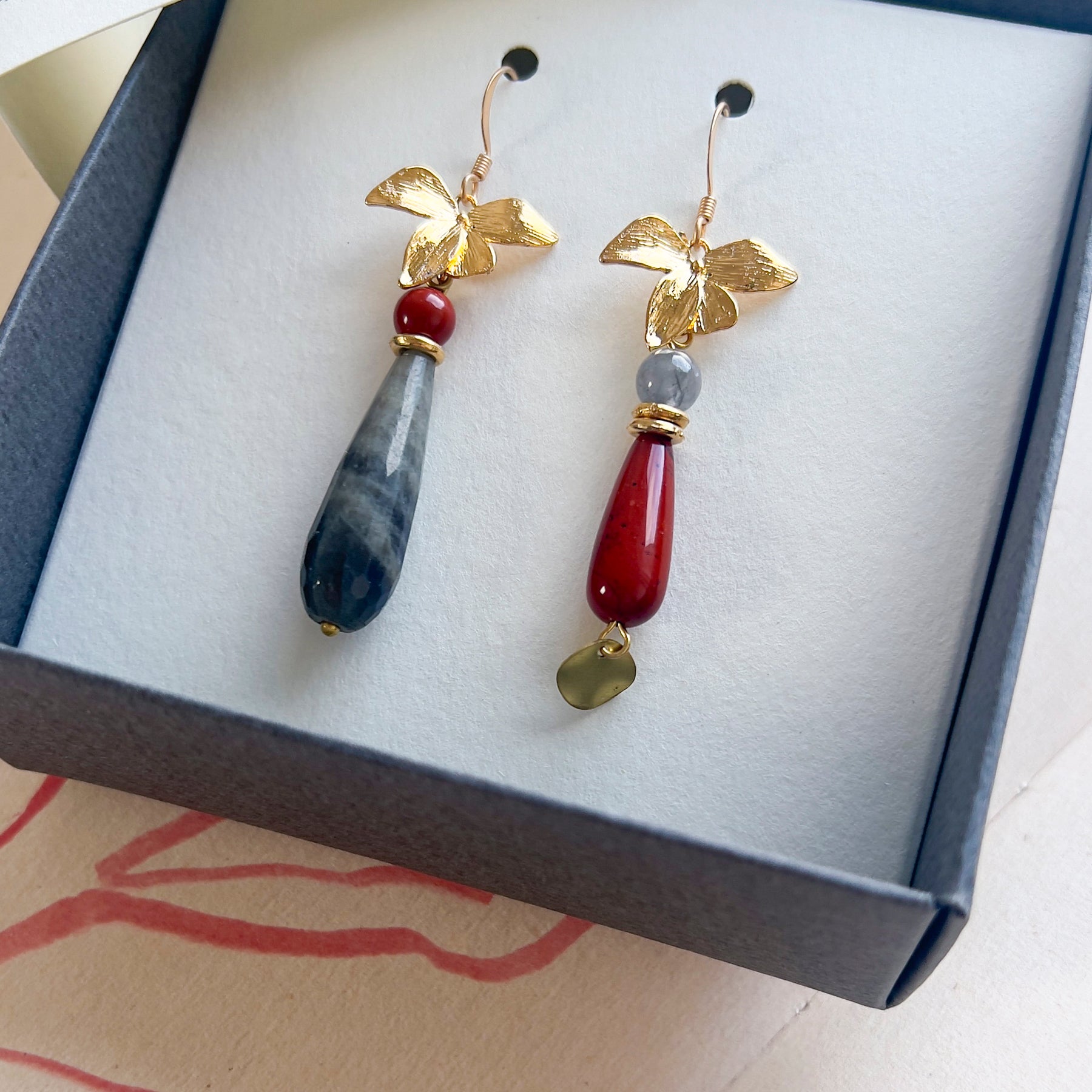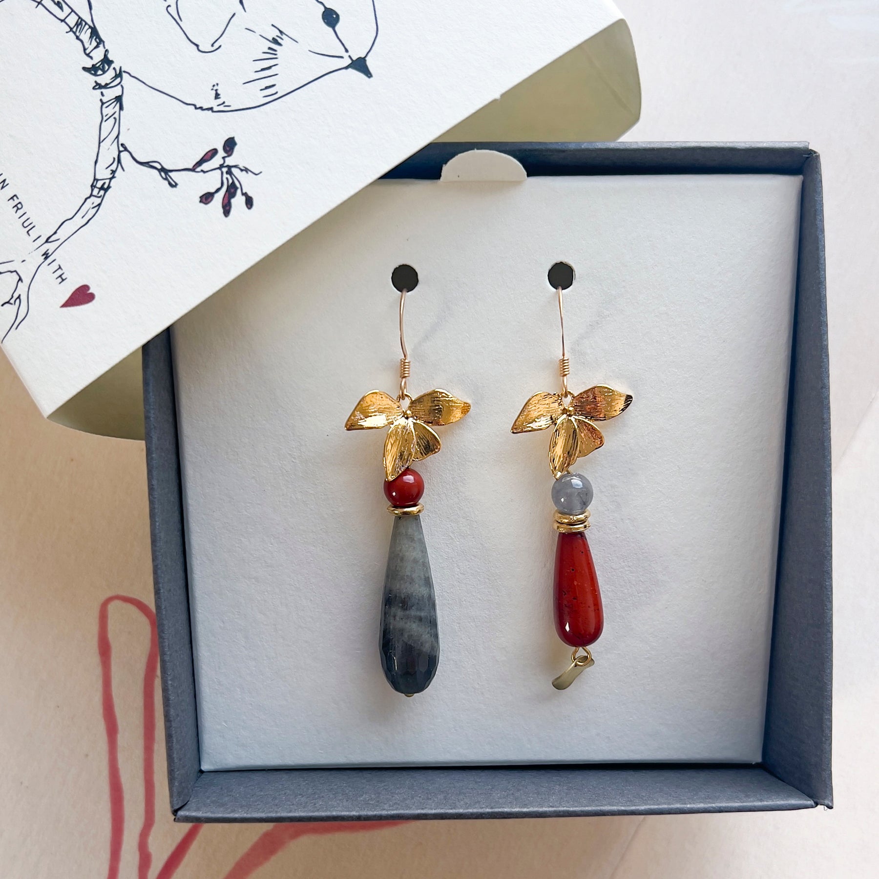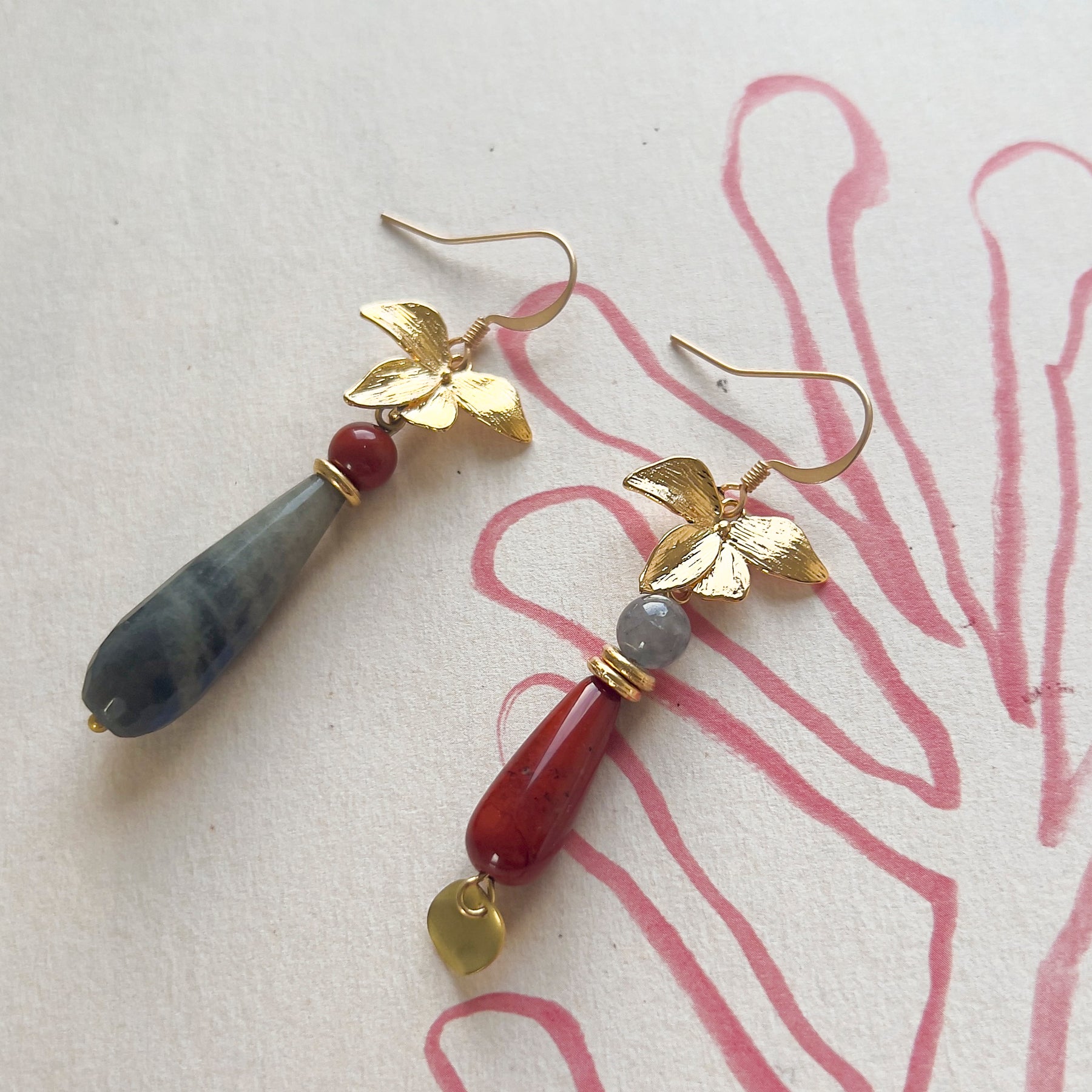 E' una coppia di orecchini asimmetrici pendenti con gocce di pietre dure e orchidee dorate