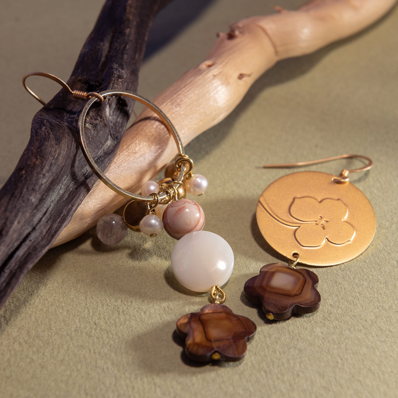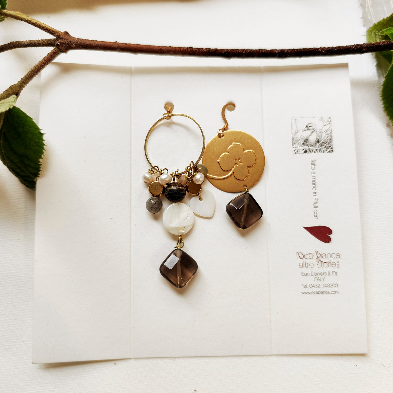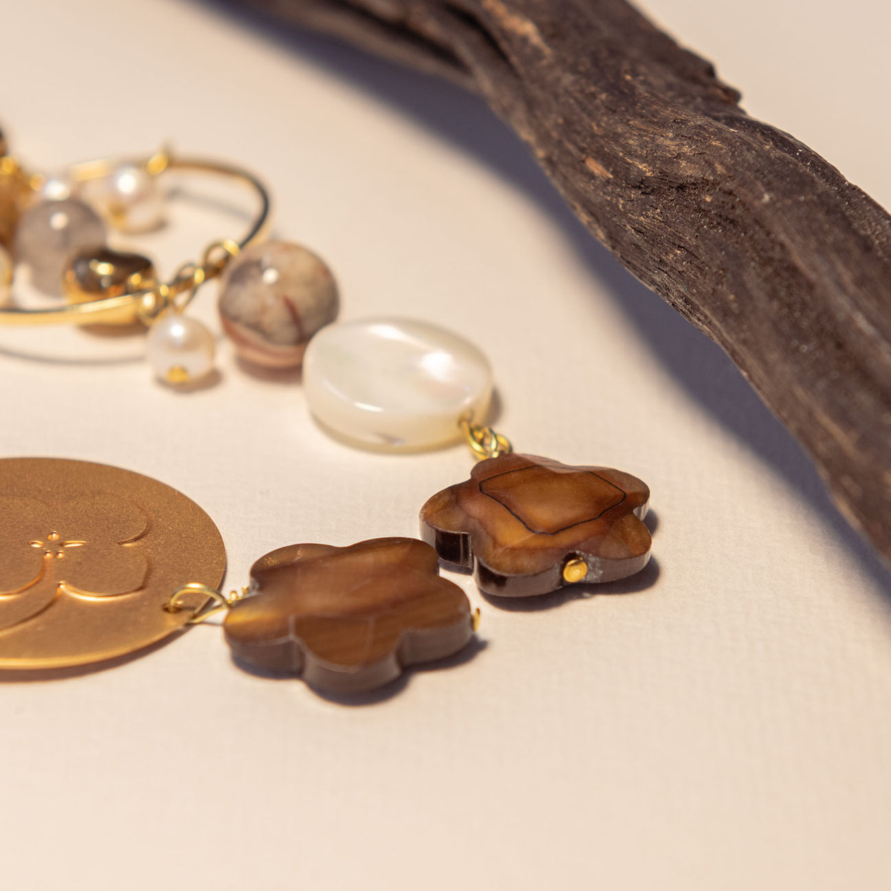 Orecchini QUADRIFOGLIO e MADREPERLA, toni bianco, marrone e oro, madreperla bianca e scura, mokaite, perle di fiume, piastrina dorata decoarata a sbalzo