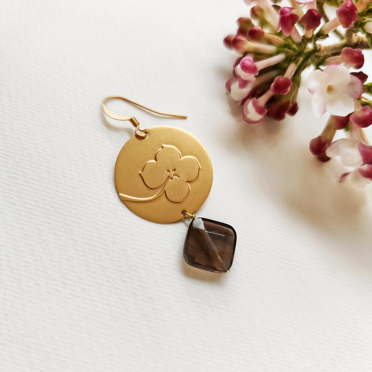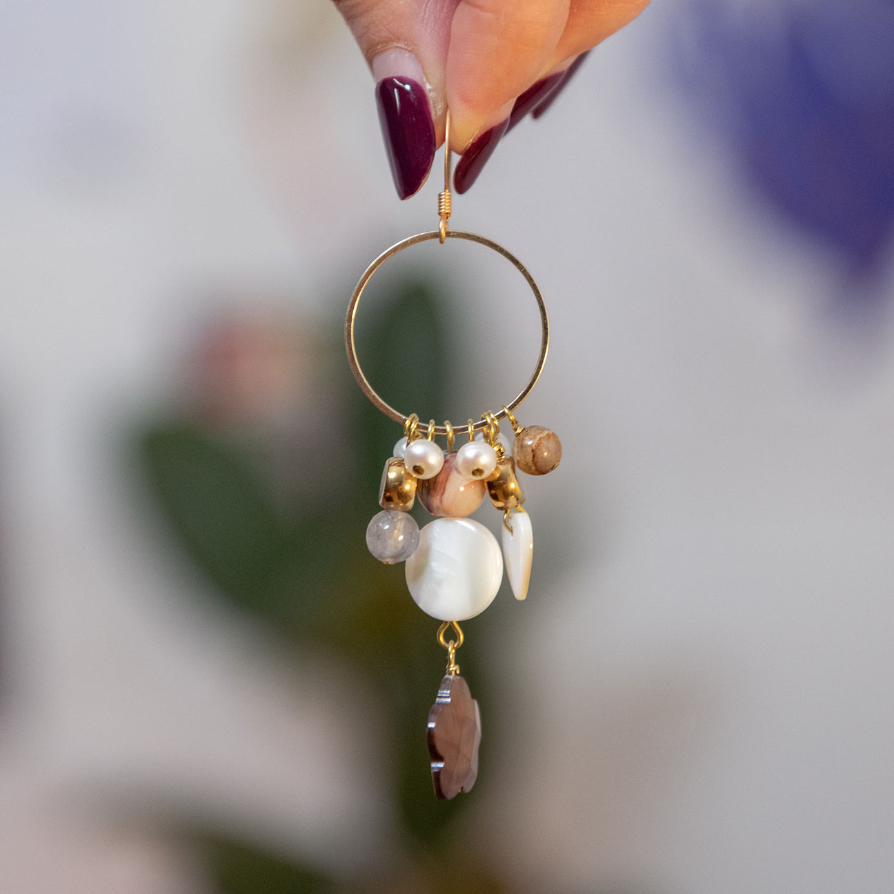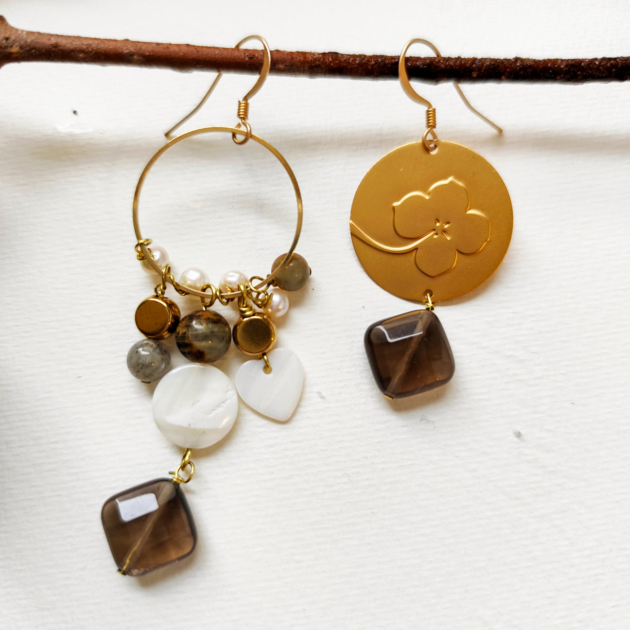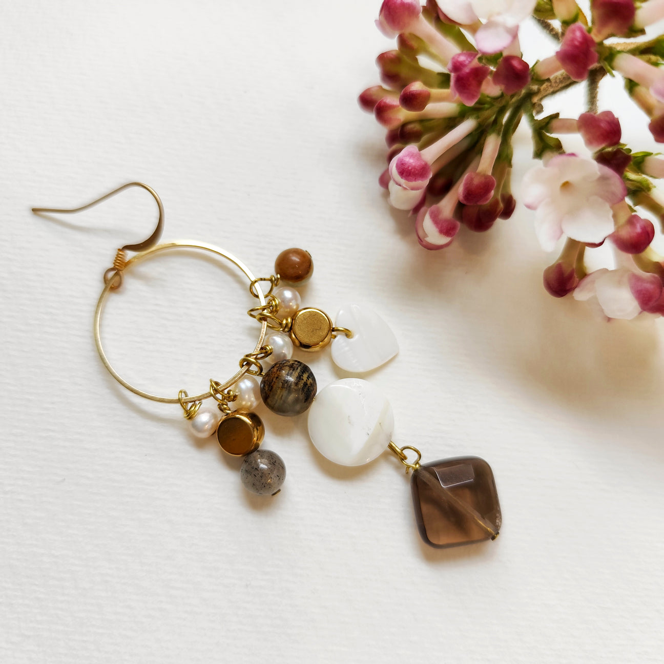 Orecchini QUADRIFOGLIO e MADREPERLA, toni bianco, marrone e oro, madreperla bianca e scura, mokaite, perle di fiume, piastrina dorata decoarata a sbalzo