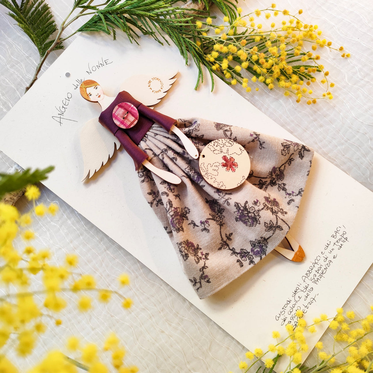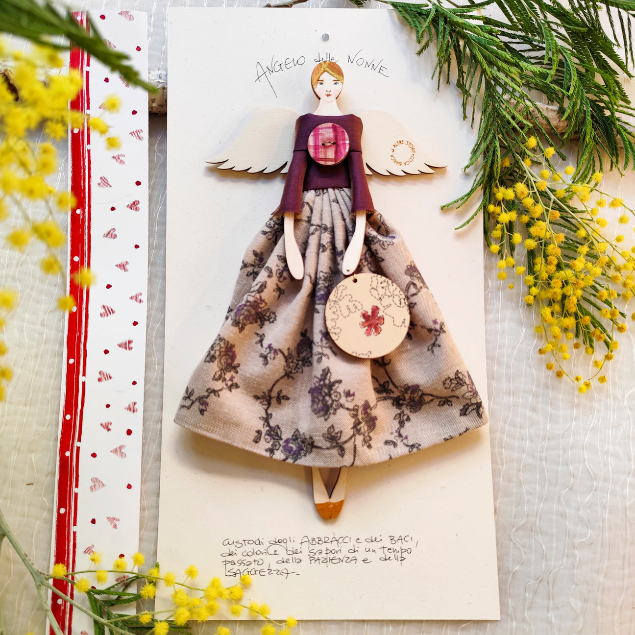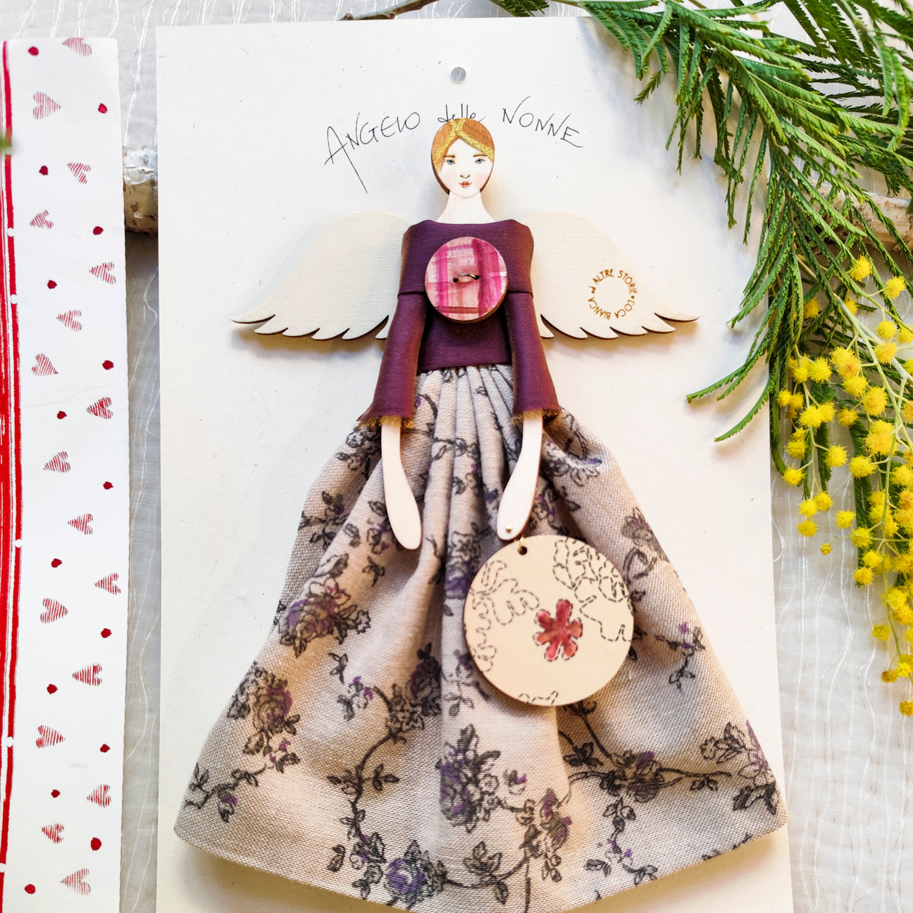 Angeli di legno di pioppo dipinti e vestiti a mano, abiti in tessuti pregiati, seta, cotone, raso o altro utilizzando stoffe di fine serie e upcycling. Regalo culturale e poetico.