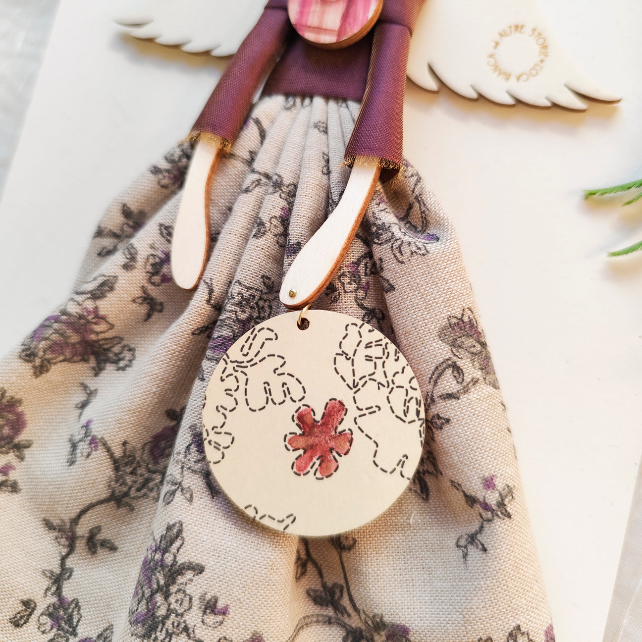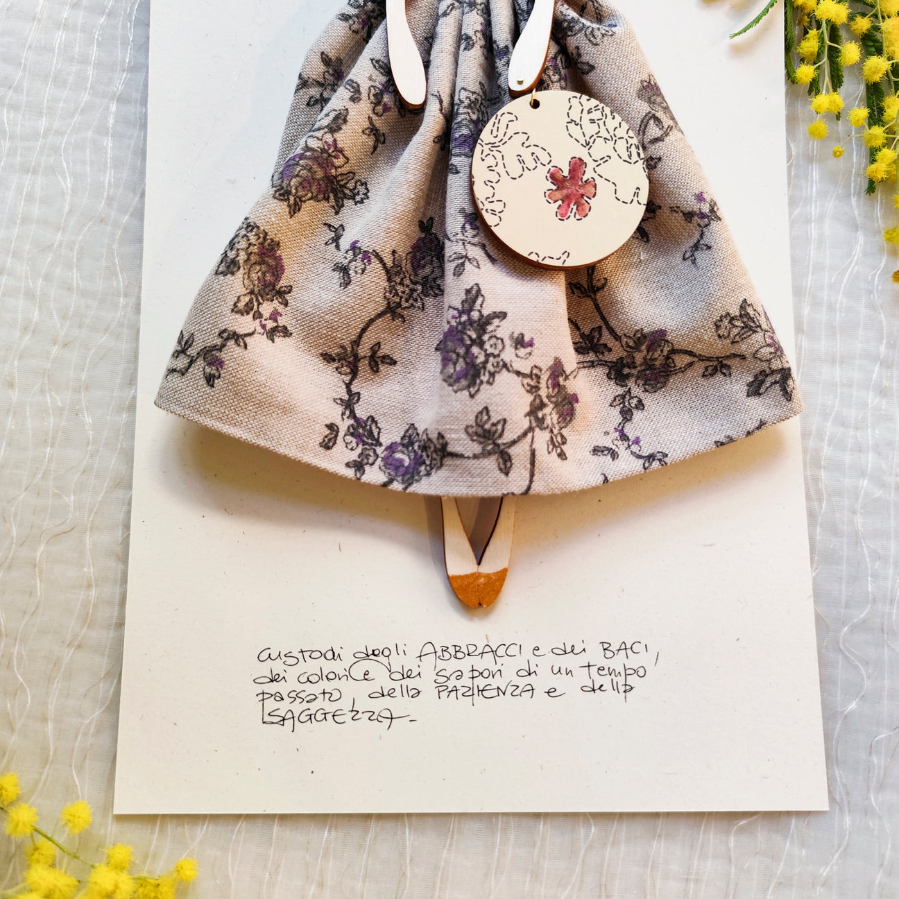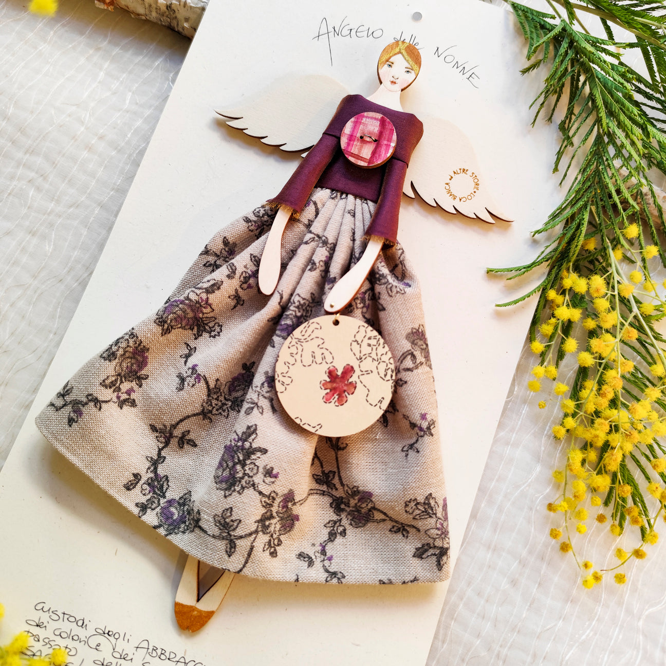 Angeli di legno di pioppo dipinti e vestiti a mano, abiti in tessuti pregiati, seta, cotone, raso o altro utilizzando stoffe di fine serie e upcycling. Regalo culturale e poetico.