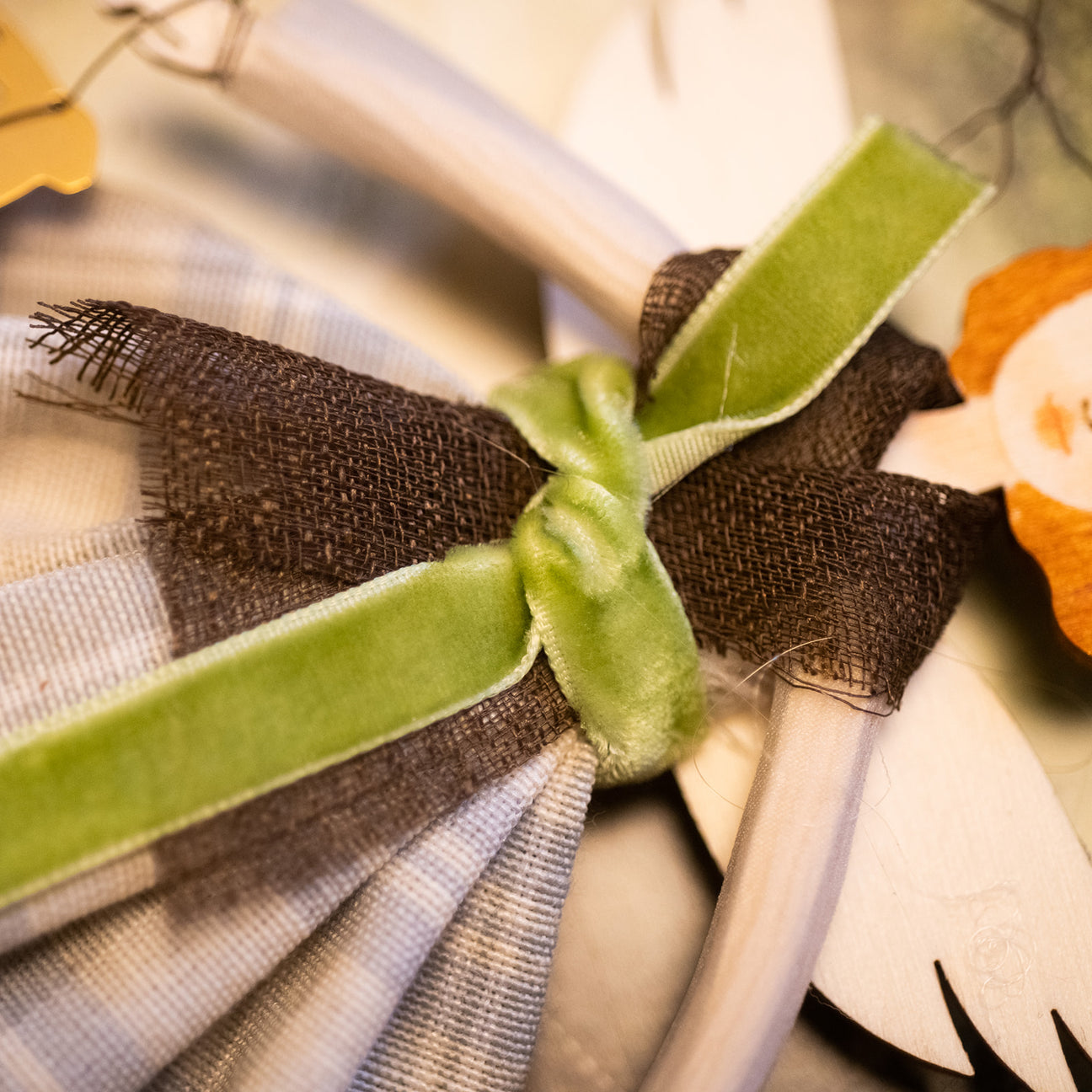 elaborato con gonna in misto lino scozzese, top marrone, cintura in velluto verde chiaro