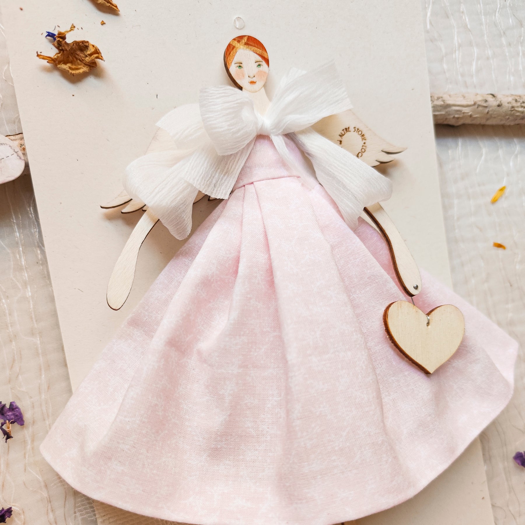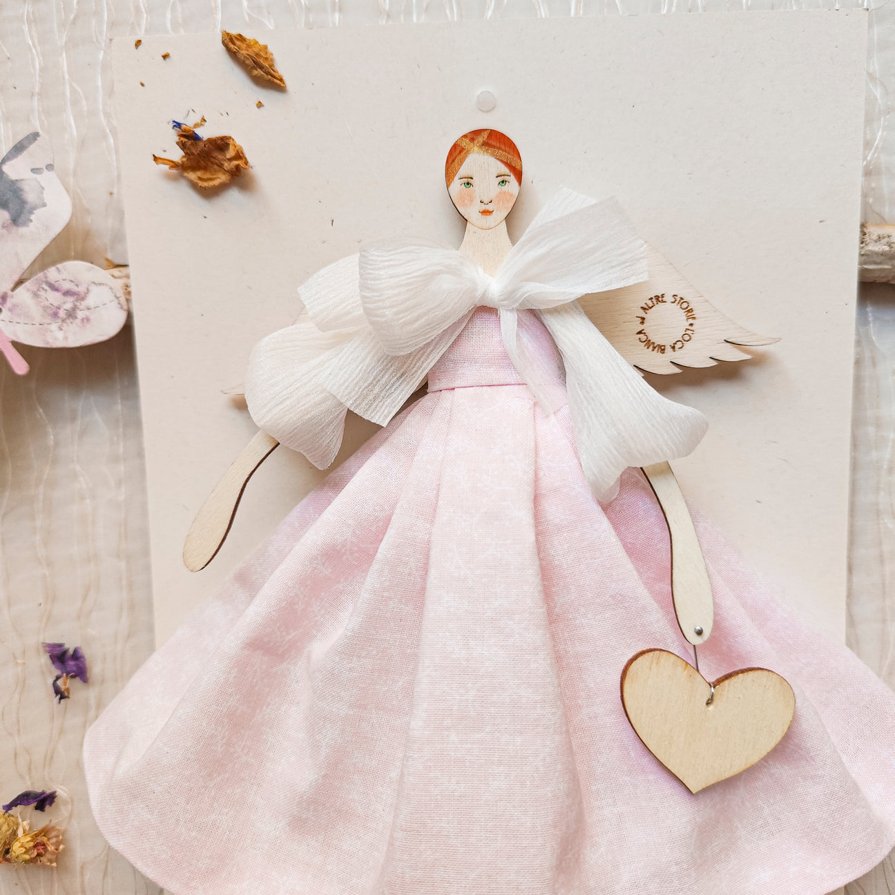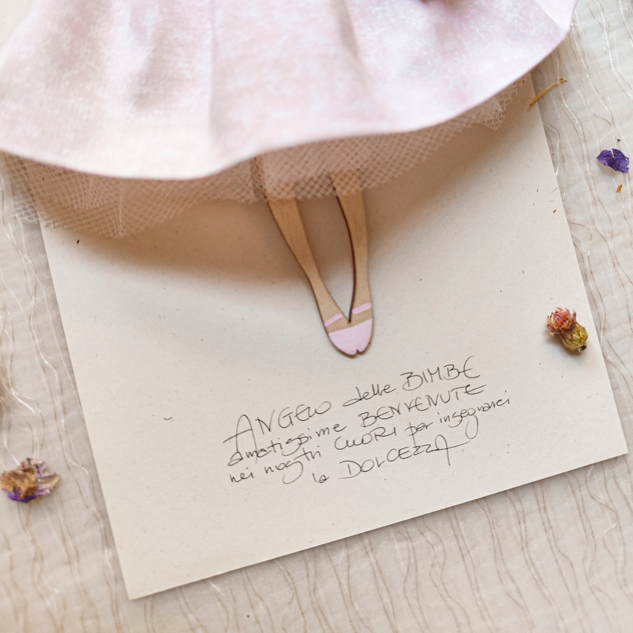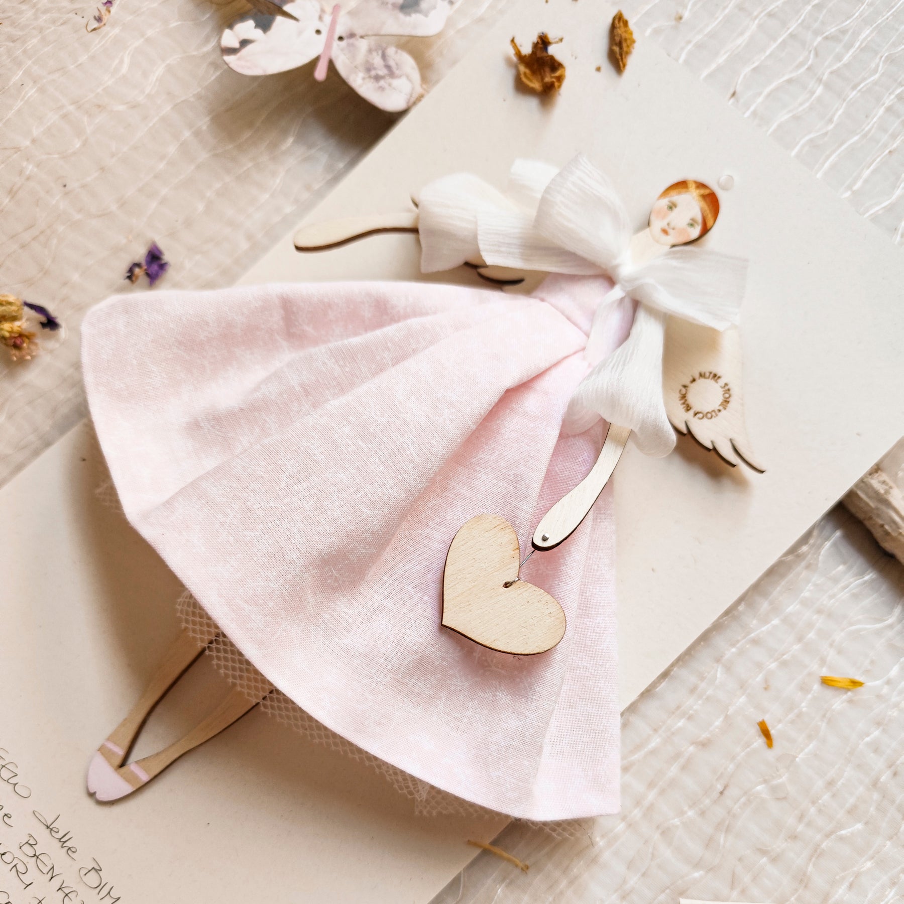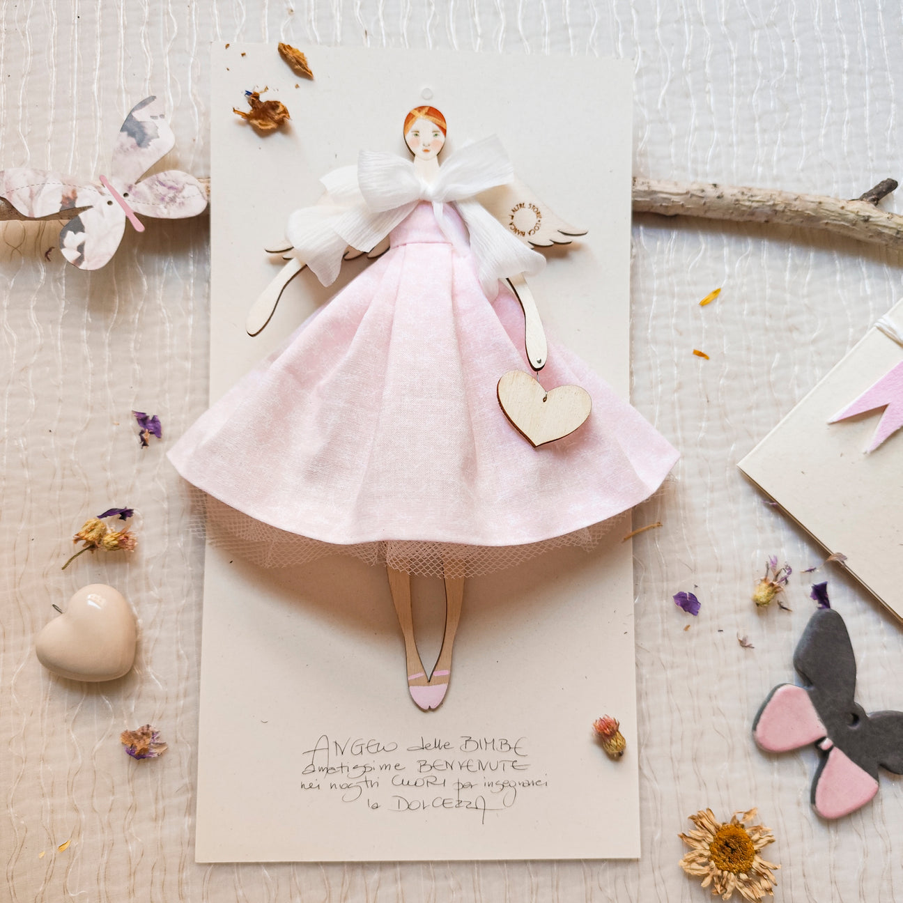 ANGELO in legno di pioppo dipinto e vestito a mano, abito in cotone rosa a poi e fiocco in raso; piccolo accessorio in legno a forma di agnello.