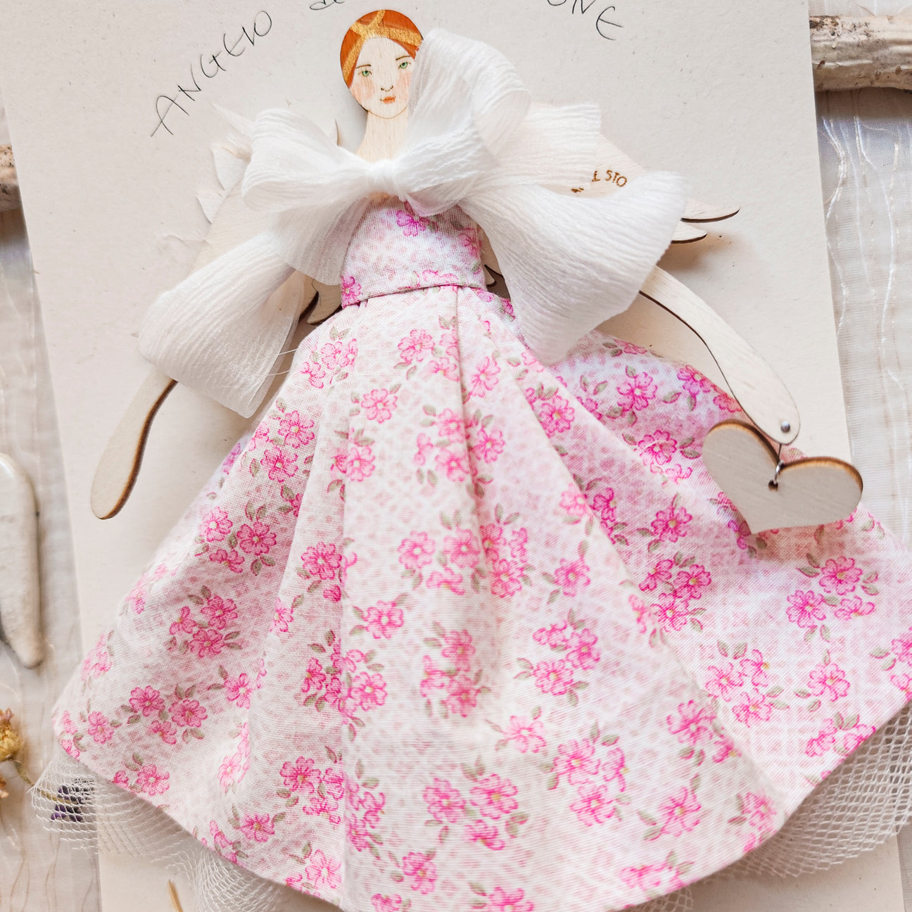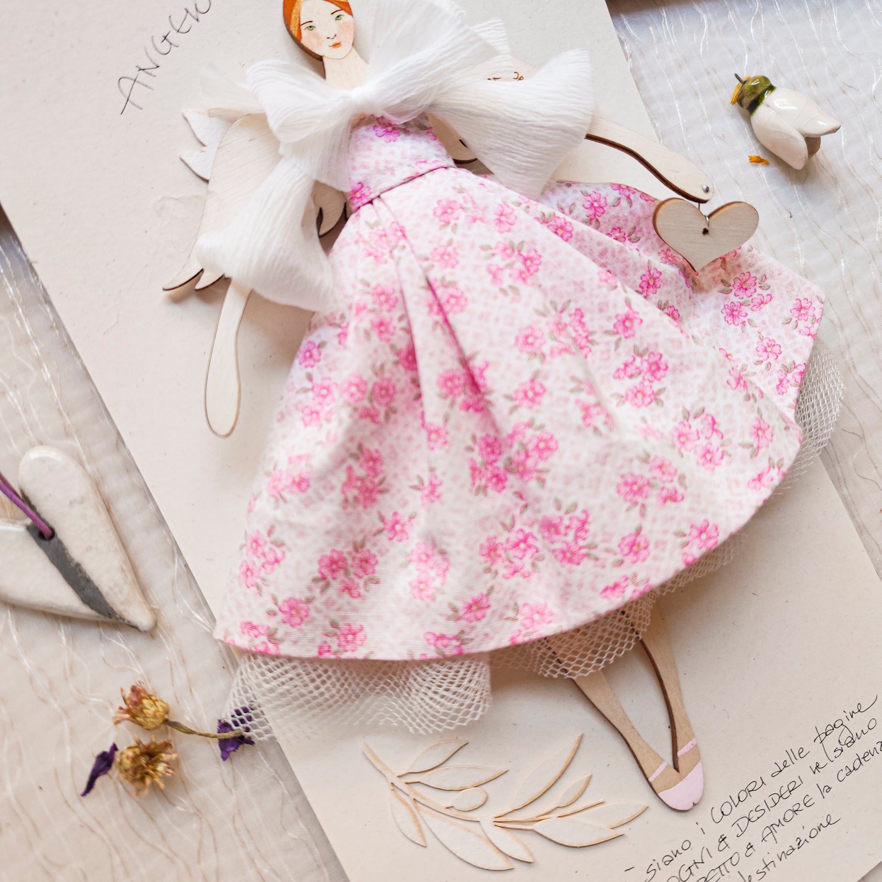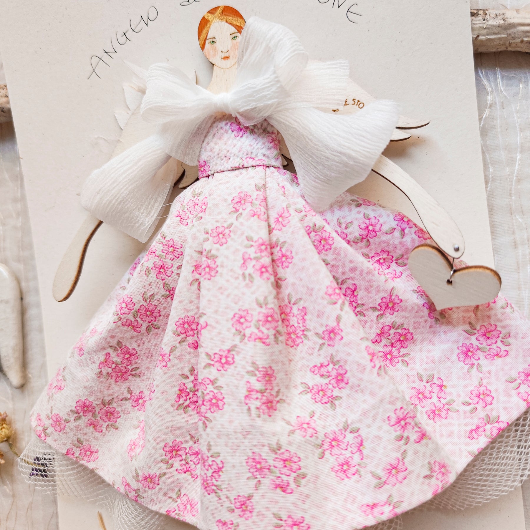 ANGELO in legno di pioppo dipinto e vestito a mano, abito di cotone con stampa a fiorellini, sottogonna di tulle e top con fiocco in organza, accessorio a forma di rametto d'ulivo, in carta