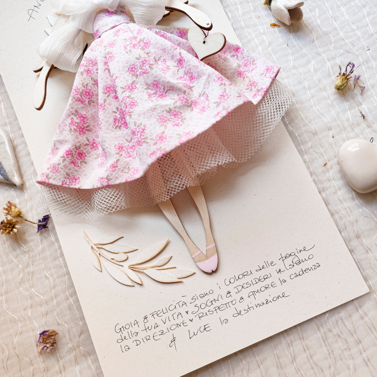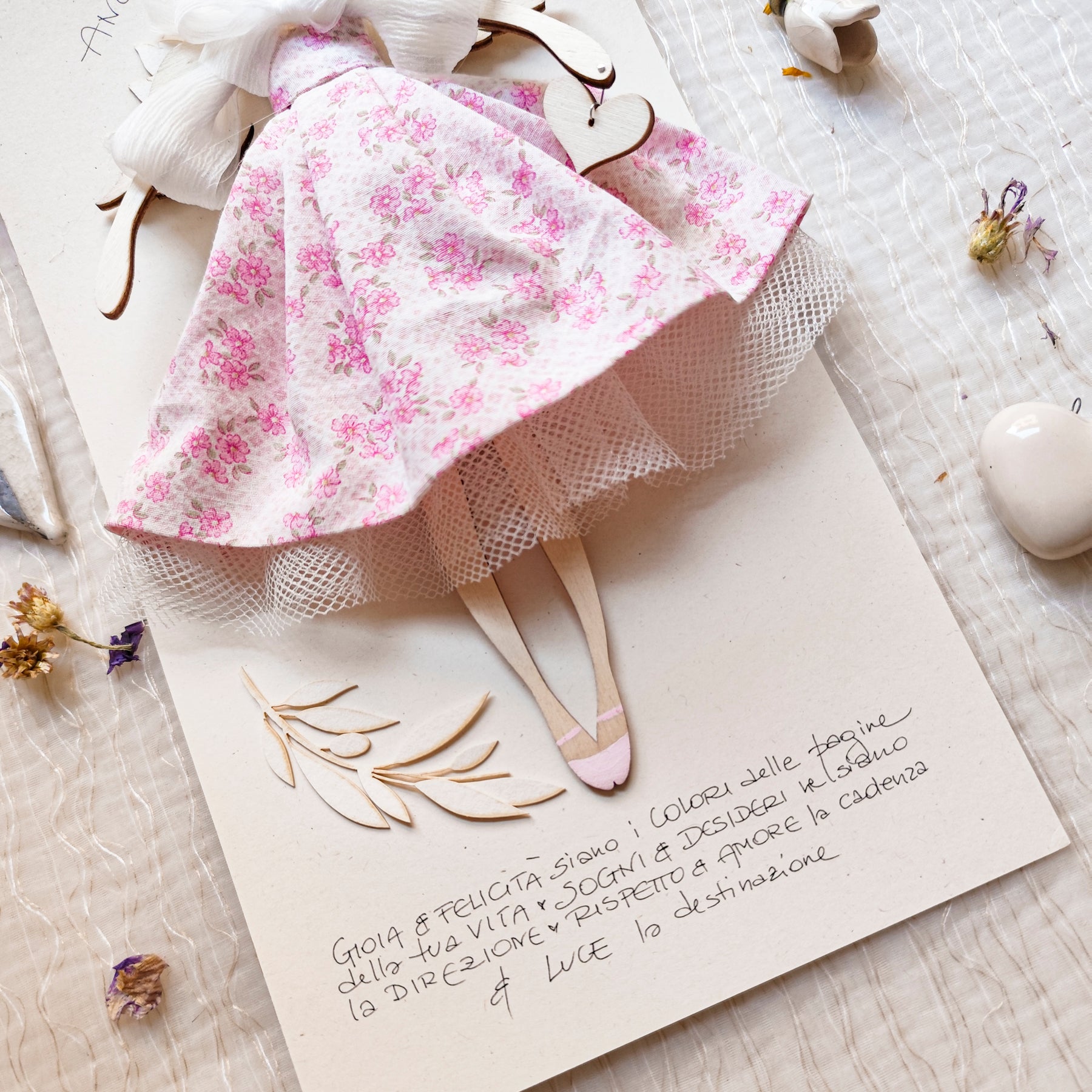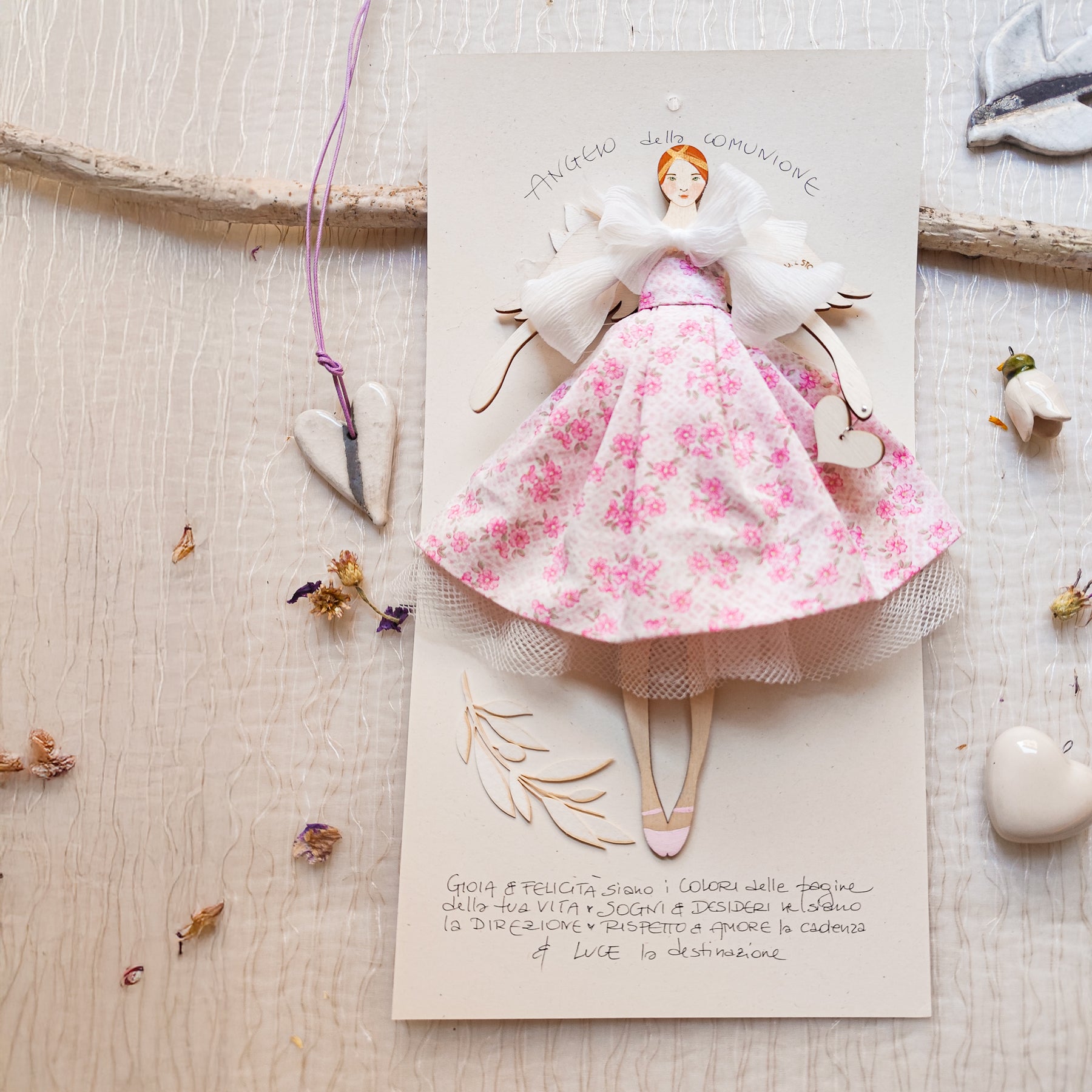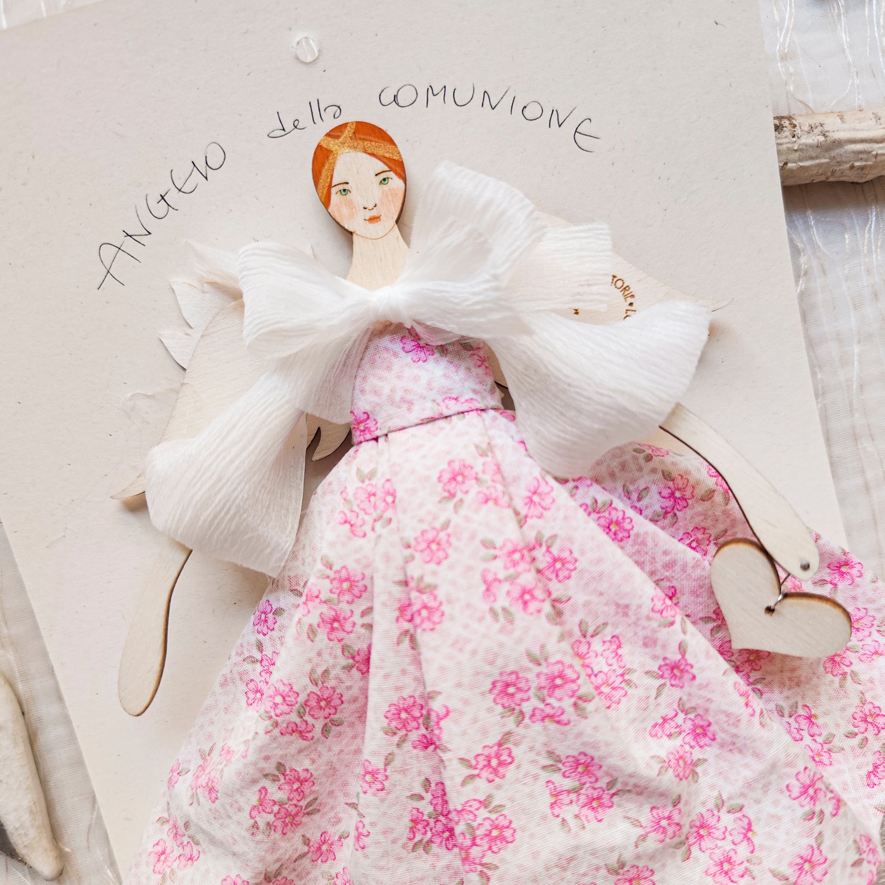 ANGELO in legno di pioppo dipinto e vestito a mano, abito di cotone con stampa a fiorellini, sottogonna di tulle e top con fiocco in organza, accessorio a forma di rametto d'ulivo, in carta