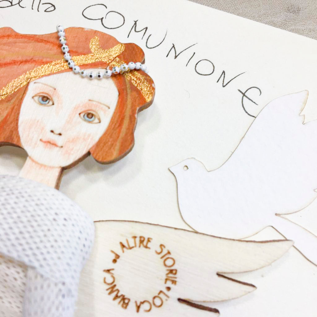 Angelo della Prima Comunione piccolo, abito in cotone, stampa fiori, sottogonna in tulle e accessorio in carta, colombina bianca. Scritta a mano. Regalo culturale e poetico