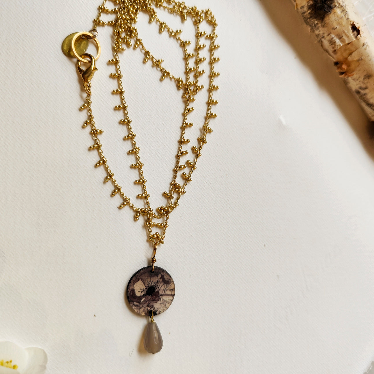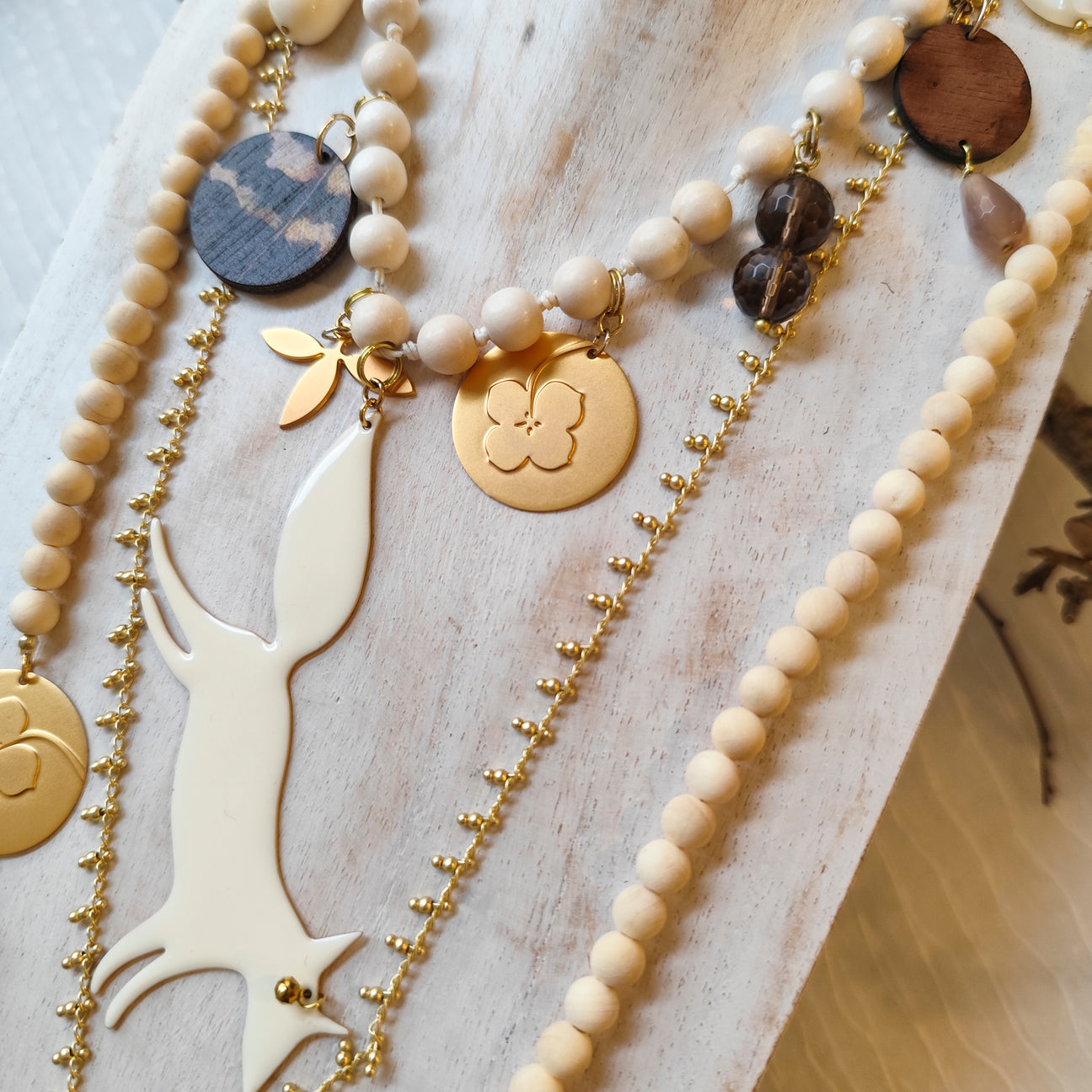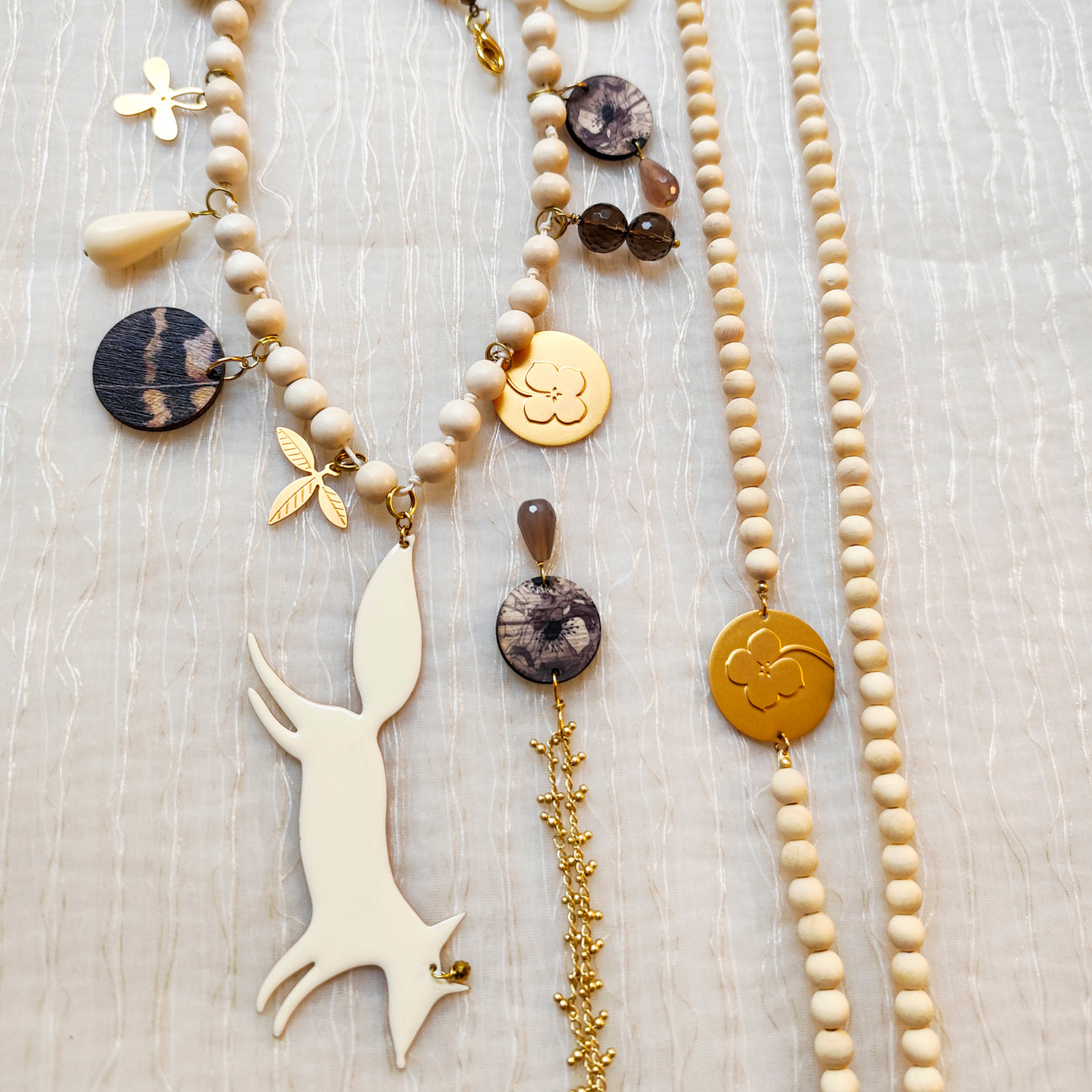 Legno bianco, catenella a rosario, avorio vegetale, per i charms: ottone dorato e smaltato a mano, ottone dorato a sbalzo e intagliato, cristalli sfaccettati, agata sfaccettata, avorio vegetale, madreperla bianca, legno wengue stampato e decorato ad inchiostro.