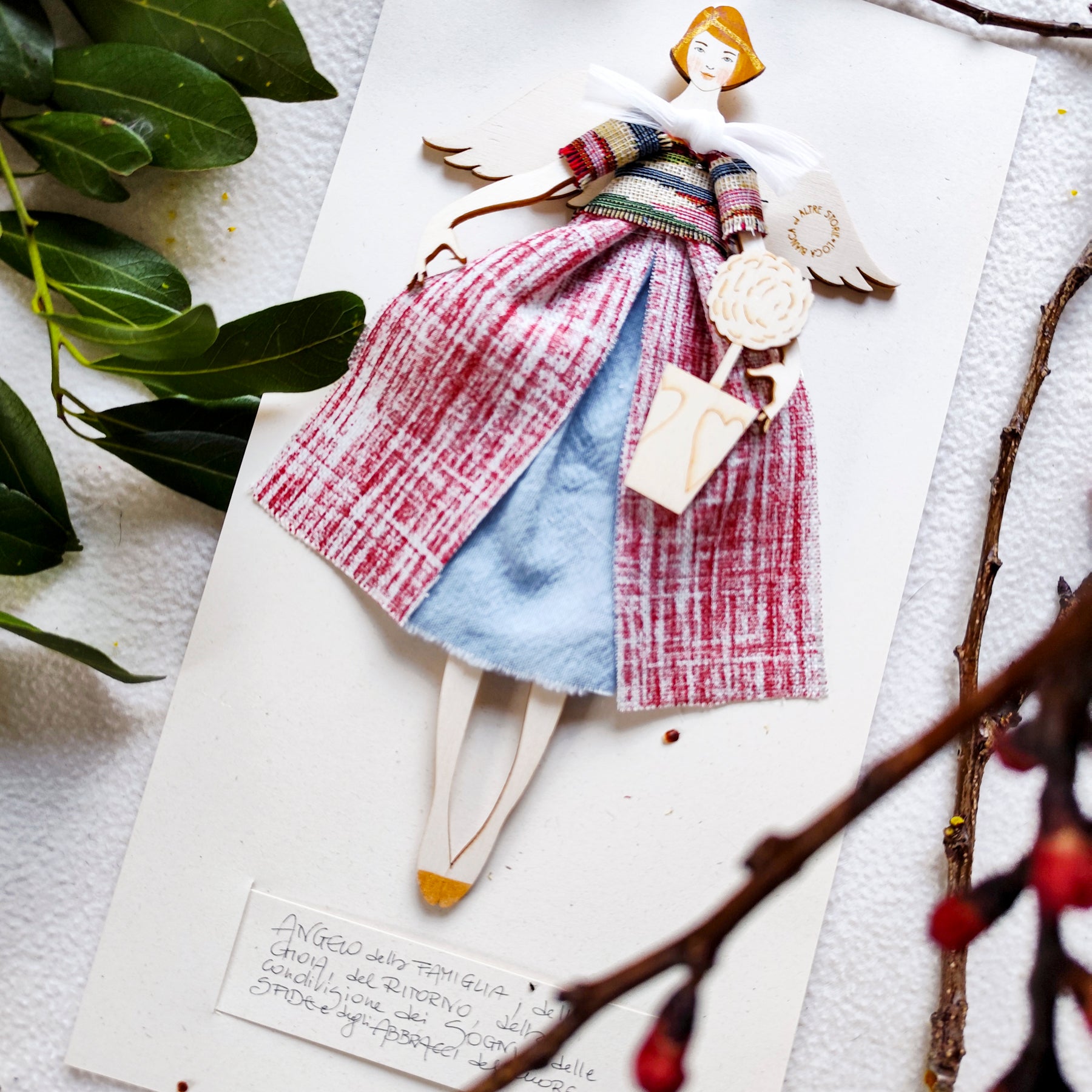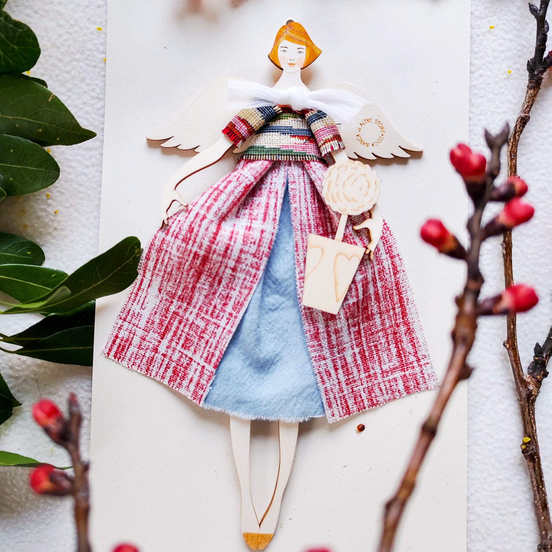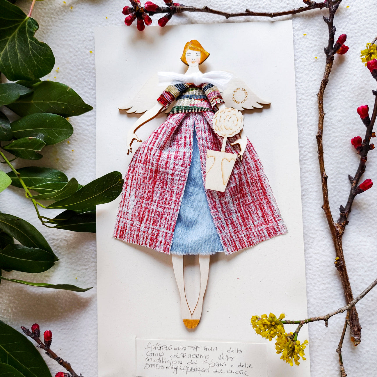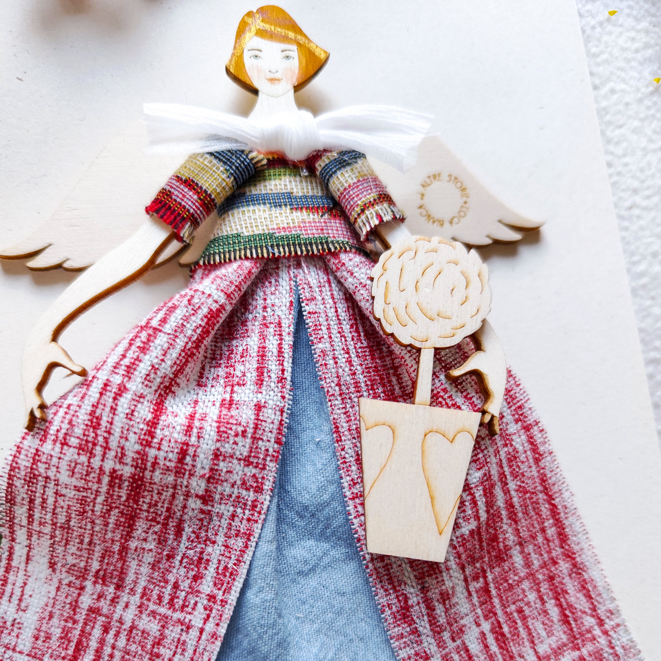 ANGEL in poplar wood painted and decorated by hand, organza and ivory silk dress, cotton top with floral design, antique pink pleated ribbon and satin bow. Small shiny lurex bracelet.